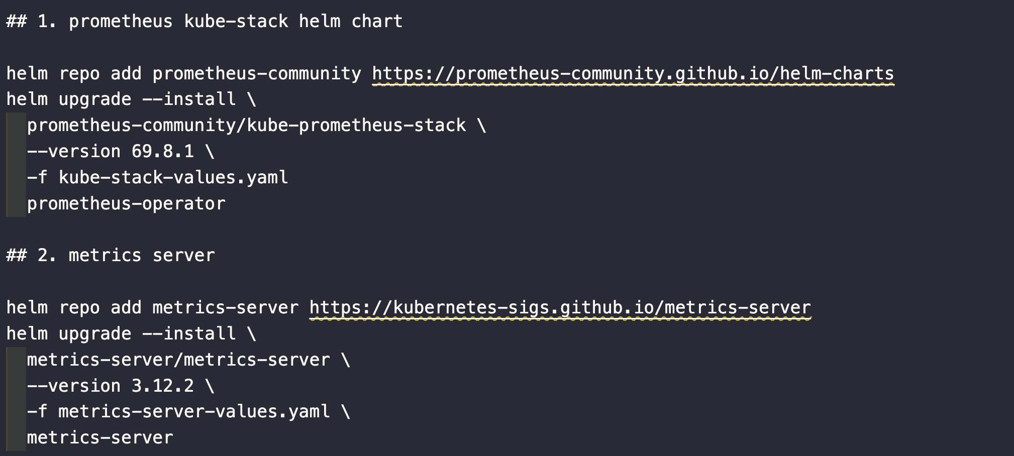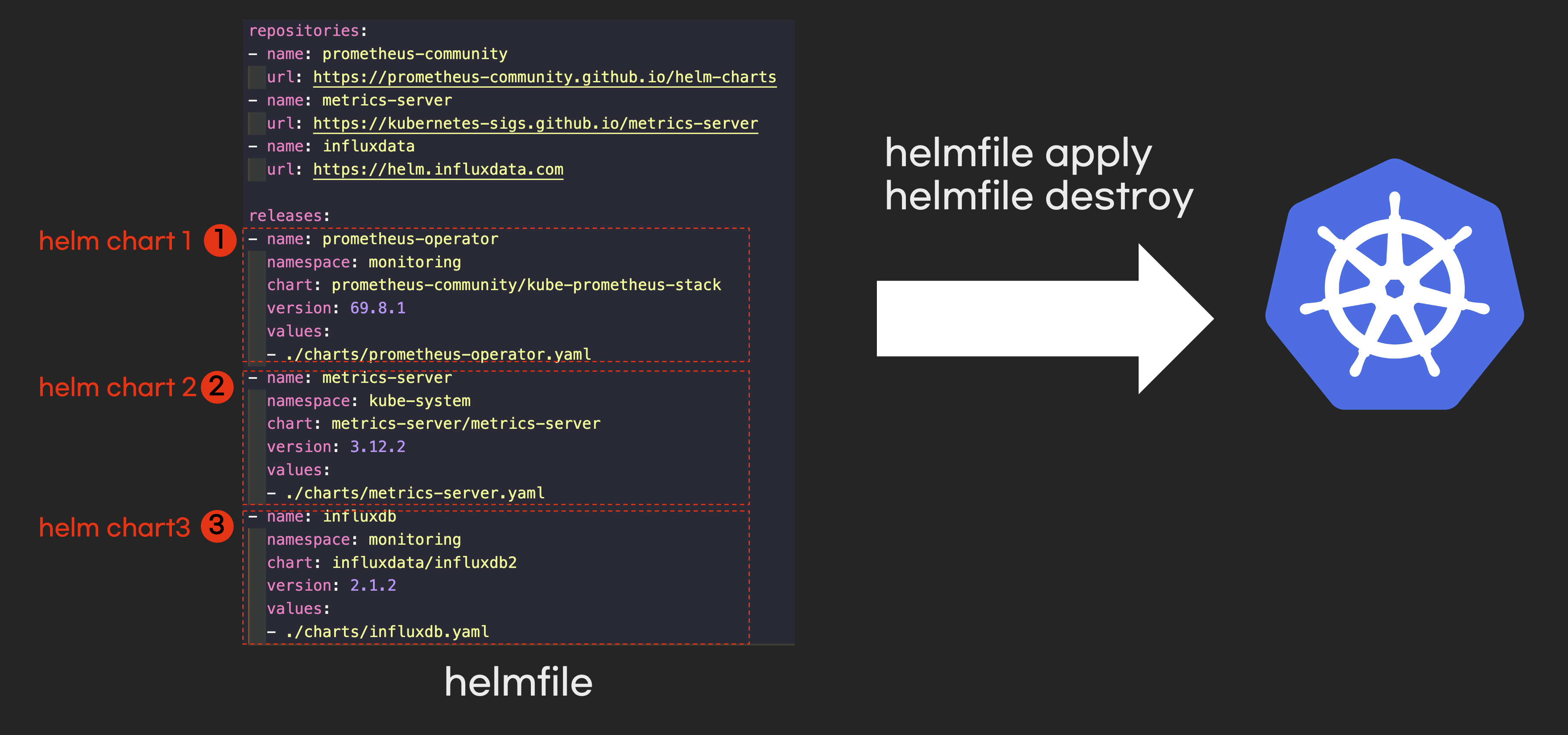 helmfile을 사용하면 helm 차트를 일일이 릴리즈안해도 됩니다. 릴리즈할 helm chart를 helmfile에 정의하고 helmfile apply명령어를 실행하면 한번에 helm 차트가 릴리즈됩니다. 삭제하고 싶으면 helm destroy를 하면 됩니다.