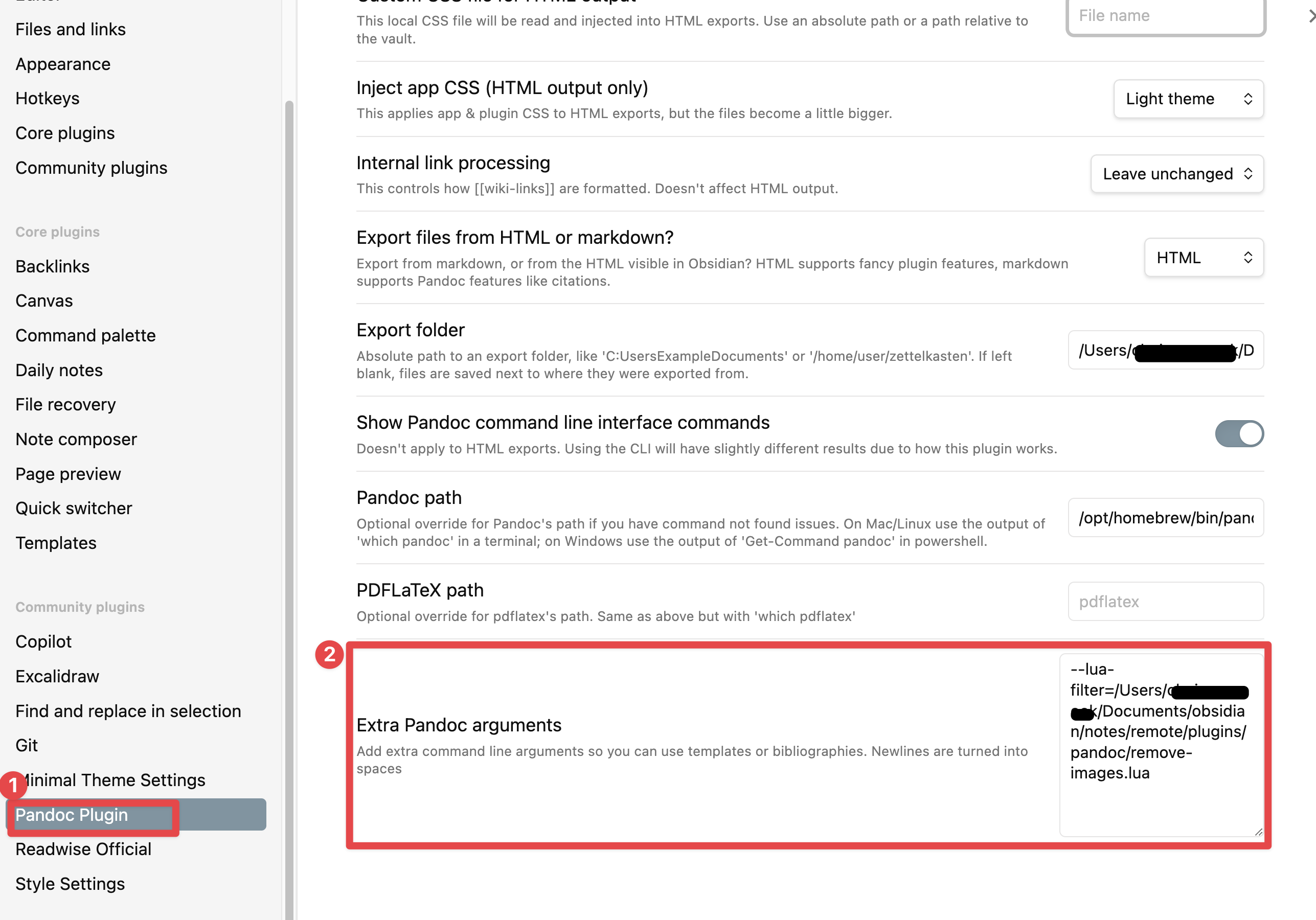 3. 옵시디언 설정(MacOS기준: cmd + ,)에서 pandoc 플러그인 메뉴를 엽니다. 그리고 "Extra pandoc argument"에 2번과정에 만든 lua 스크립트 경로를 입력합니다. lua 스크립트 경로는 꼭 절대경로입니다.