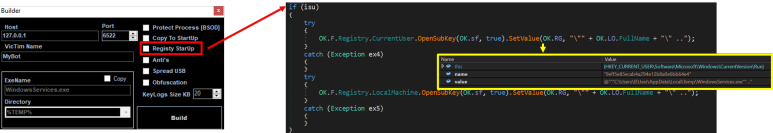 njrat를 HKCU(HKLM)\Software\Microsoft\Windows\CurrentVersion\Run에 등록하여 지속 메커니즘을 설정합니다. 빌더에서 Registry StartUp체크박스를 선택하면 실행됩니다.