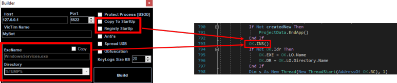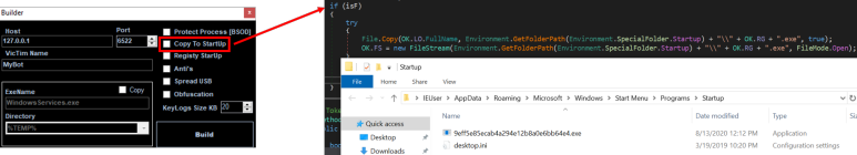시작 프로그램을 관리하는 StartUp폴더에 njrat를 복사합니다. 빌더에서 Copy To StartUp체크박스를 선택하면 실행됩니다.