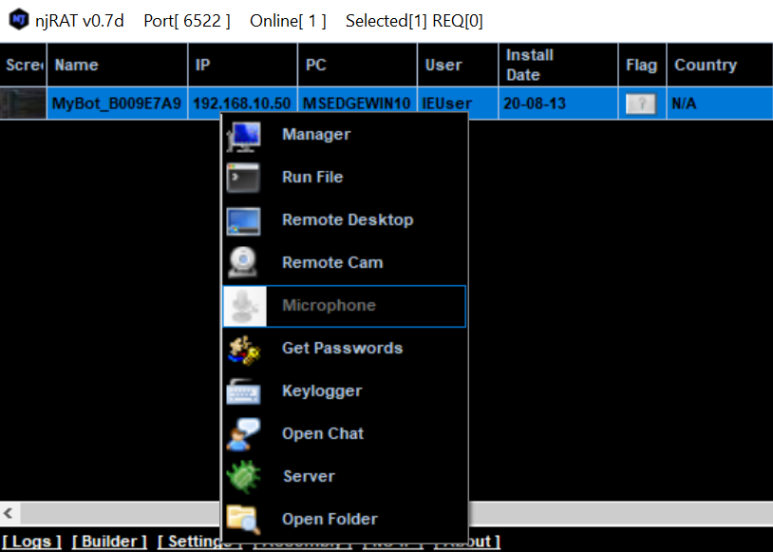 감염된 PC목록 중 하나를 선택하고 오른쪽 마우스 버튼을 클릭하면 피해자를 원격제어할 수 있는 메뉴가 표시됩니다.