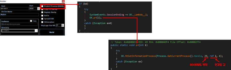njrat를 종료되면 강제로 블루스크린을 발생(관리자 권한 필요)시킵니다. 재부팅되면 지속 메커니즘때문에 njrat가 자동으로 실행됩니다.