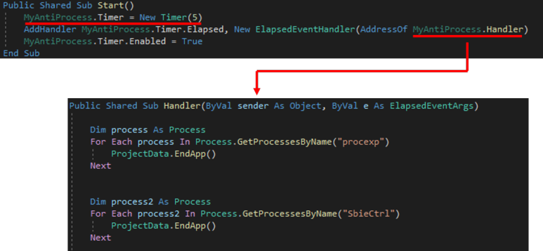 타이머 함수를 사용하여 실행환경을 검사합니다. 샌드박스 또는 가상환경에서 실행되거나 분석도구 실행을 감지하면 악성행위를 중단합니다. njrat가 검사목록은 다음과 같습니다.