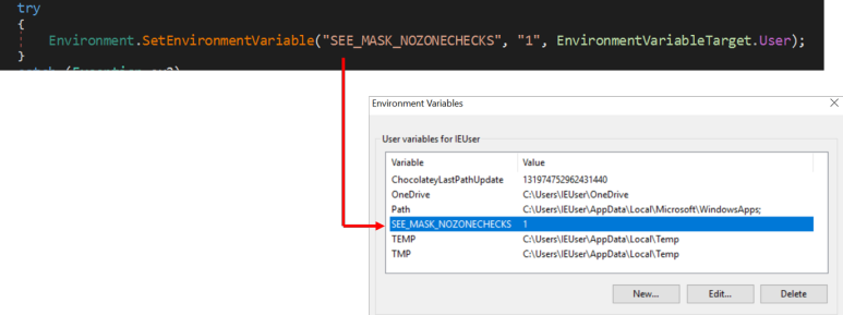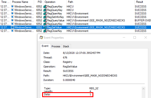 환경변수를 설정하여 UAC를 우회합니다. SEE_MASK_NOZONECHECKS환경변수를 1로 설정하면 다운로드 받은 파일을 실행할 때 UAC가 우회됩니다.