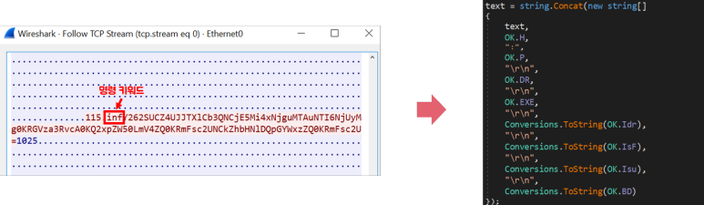 첫 번째 메세지를 전송하고 곧 바로 감염된 PC설정값을 전송합니다. 설정값은 빌더에서 선택한 체크박스를 의미합니다. 두 번째 메세지의 명령 키워드는 inf이고 데이터 전부가 base64인코딩되어 있습니다.