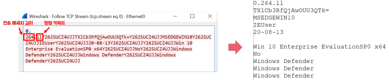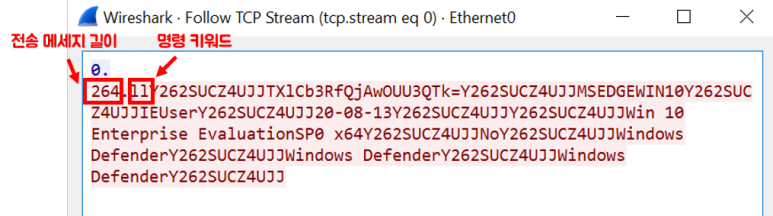 공격자와 피해자가 주고받는 데이터는 TCP프로토콜로 전송됩니다. 전송 데이터는 [데이터길이+명령 키워드+명령어 수행결과]포맷으로 구성됩니다. 공격자는 명령어 수행 내용이 생략되어 있습니다.