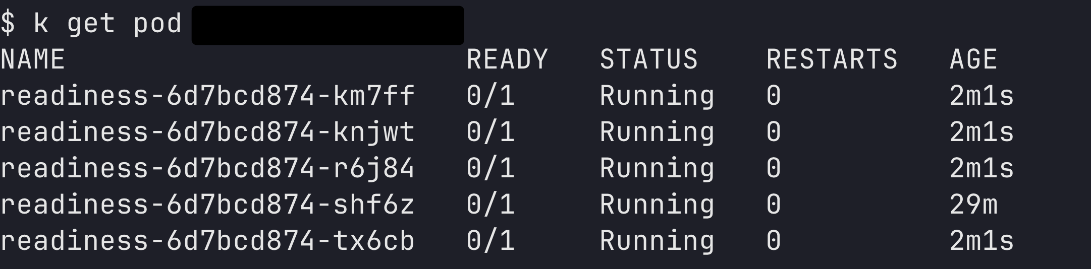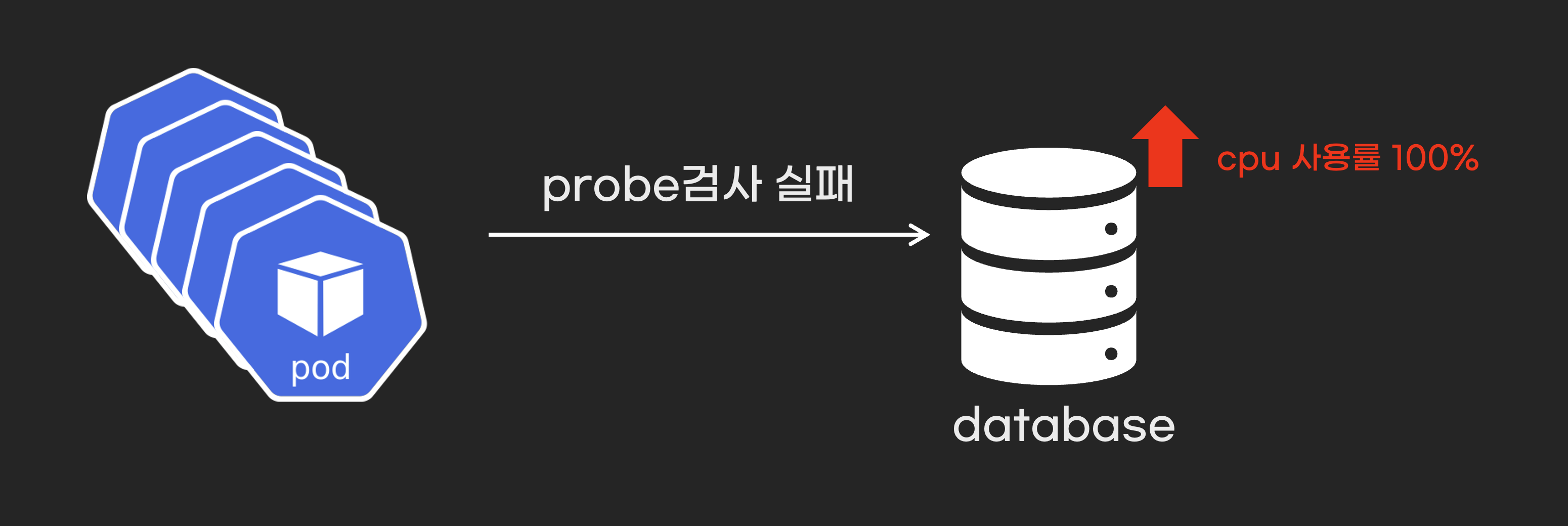 만약 데이터베이스가 비정상 상태이면 어떻게 될까요? readiness probe는 데이터베이스 영향으로 pod가 검사가 실패하고 pod는 Not ready가 됩니다. 제가 겪었던 경험은 데이터베이스의 CPU부하때문에 pod readiness probe가 실패했습니다.