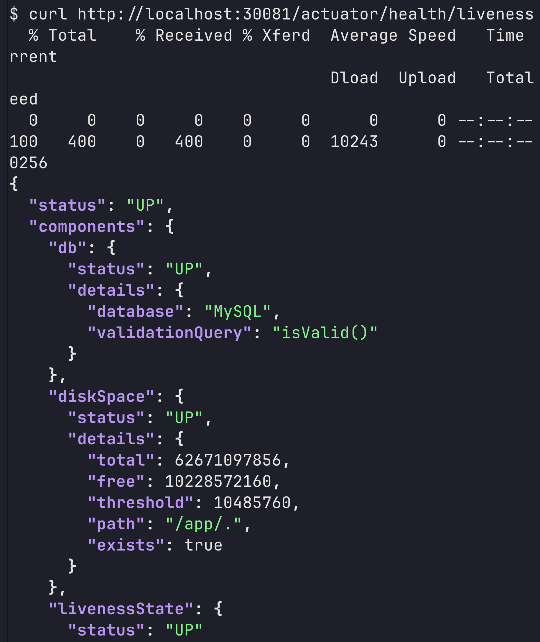 아래는 스프링에서 액츄레이터를 활성화하고 liveness API를 호출한 결과입니다.