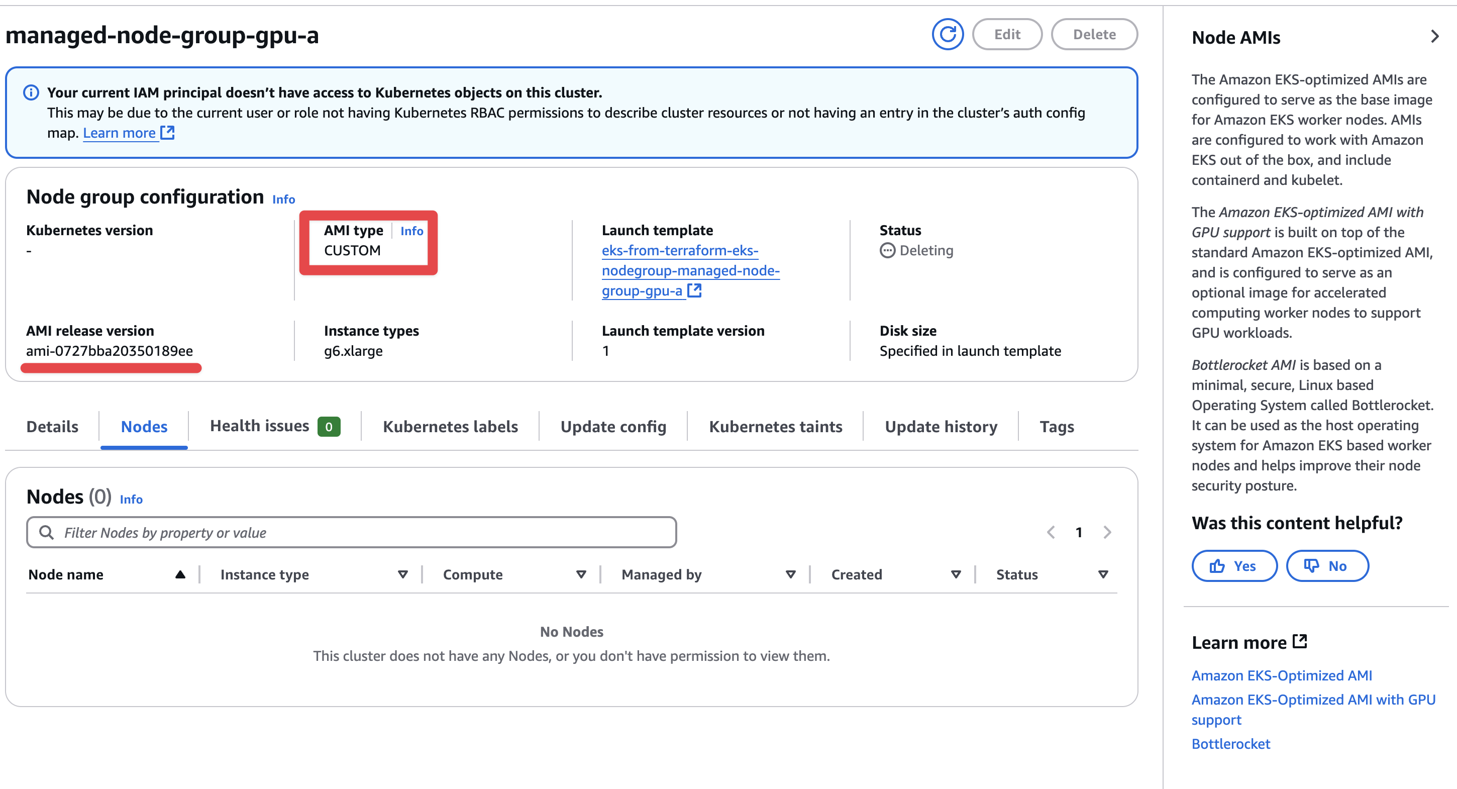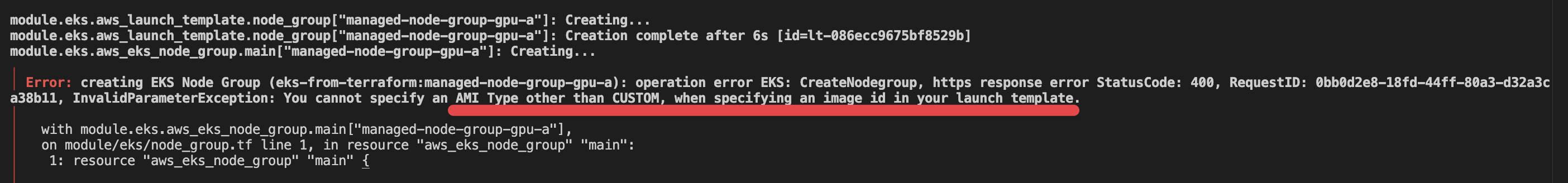 강제로 AMI type을 EKS "AL2023_x86_64_NVIDIA"로 변경하면 terraform apply에러가 발생합니다. AMI를 지정하면 AMI type이 지정이 안되는 에러입니다. 더 정확히 설명하면 launch template에 AMI_ID를 지정하면 managed node group의 AMI 타입은 CUSTOM만 허용합니다.