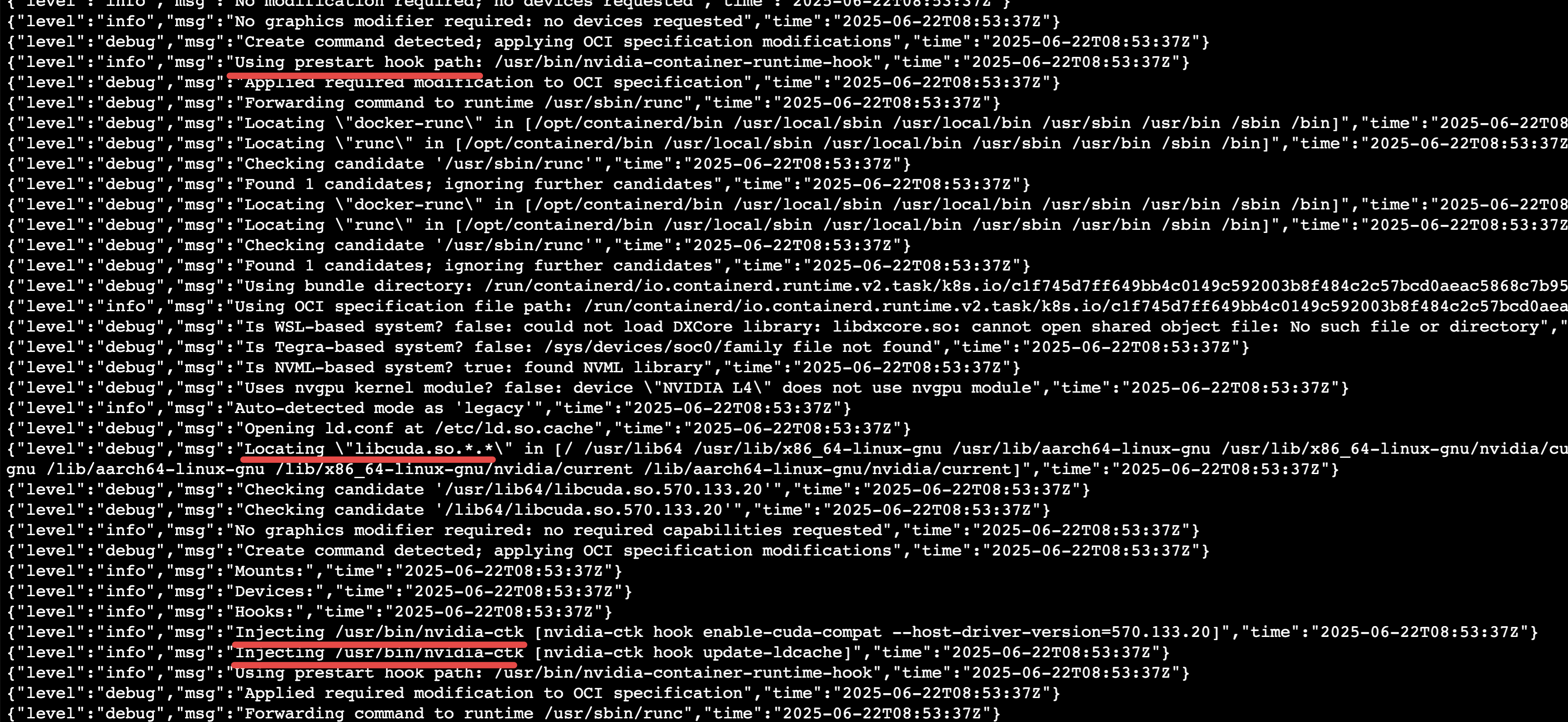 로그파일을 보면 prehook, injection 과정이 보입니다. injection은 nvidia-ctk이 담당합니다.