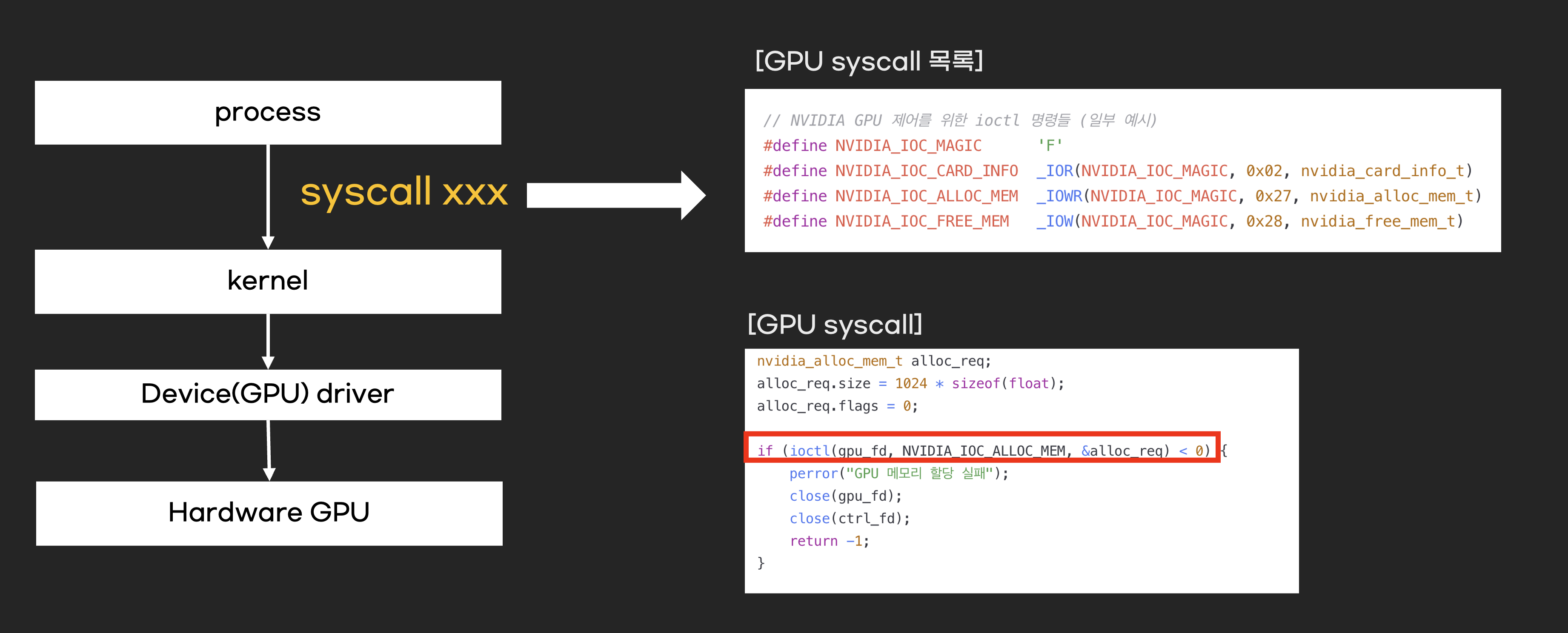 syscall이 필요한 이유는 GPU 드라이버가 커널모드에서 동작하기 때문입니다. 유저모드에서 실행되는 애플리케이션 또는 프로세스는 커널모드에 접근할 수 없기 때문에 syscall을 통해 GPU사용을 요청합니다.