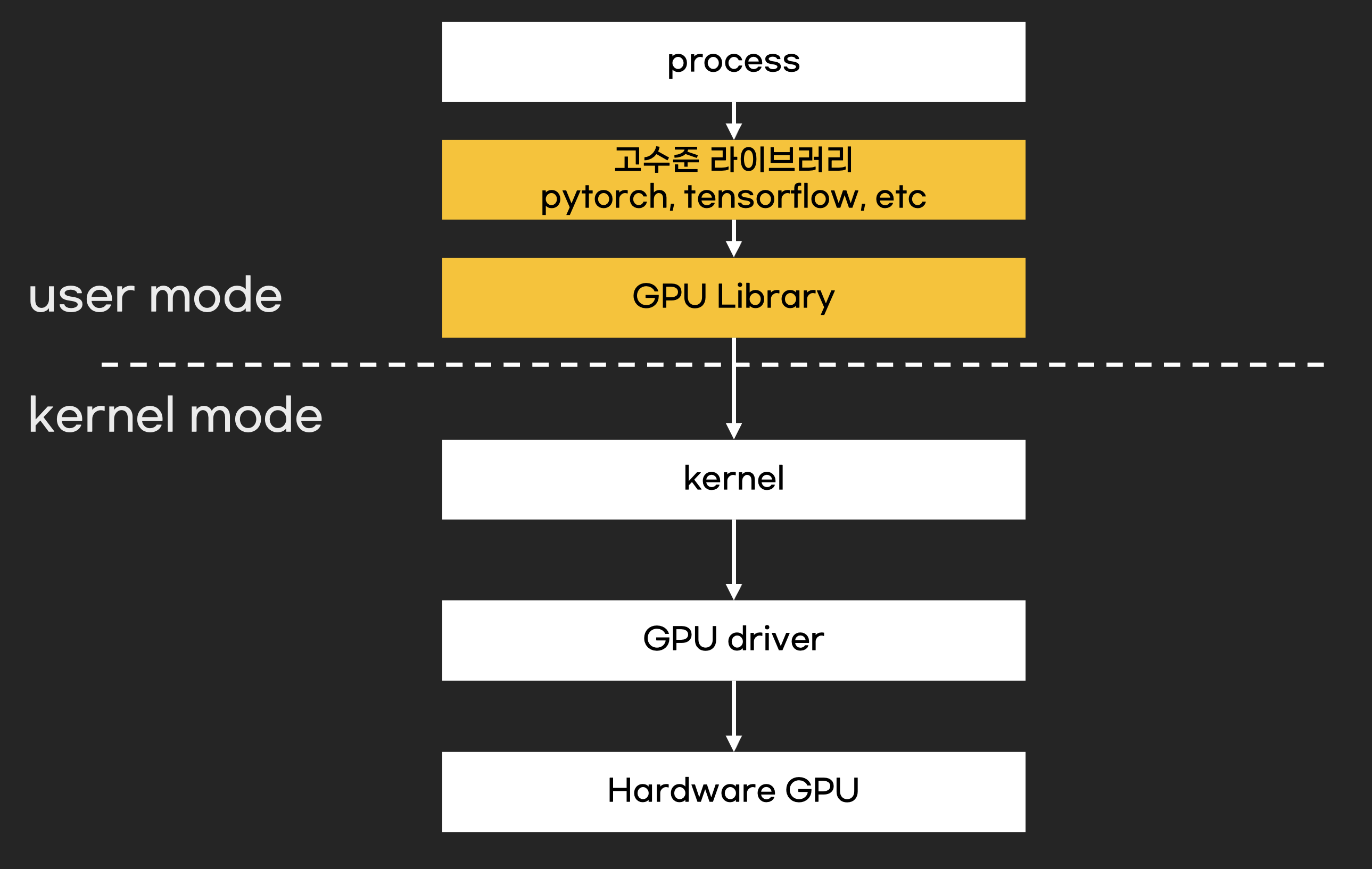 GPU 라이브러리는 필수는 아니지만 개발하는 과정에 필수로 있어야 합니다. GPU라이브러리가 없으면 개발자는 아래 그림처럼 GPU syscall을 일일이 코드단에서 호출해야 합니다.