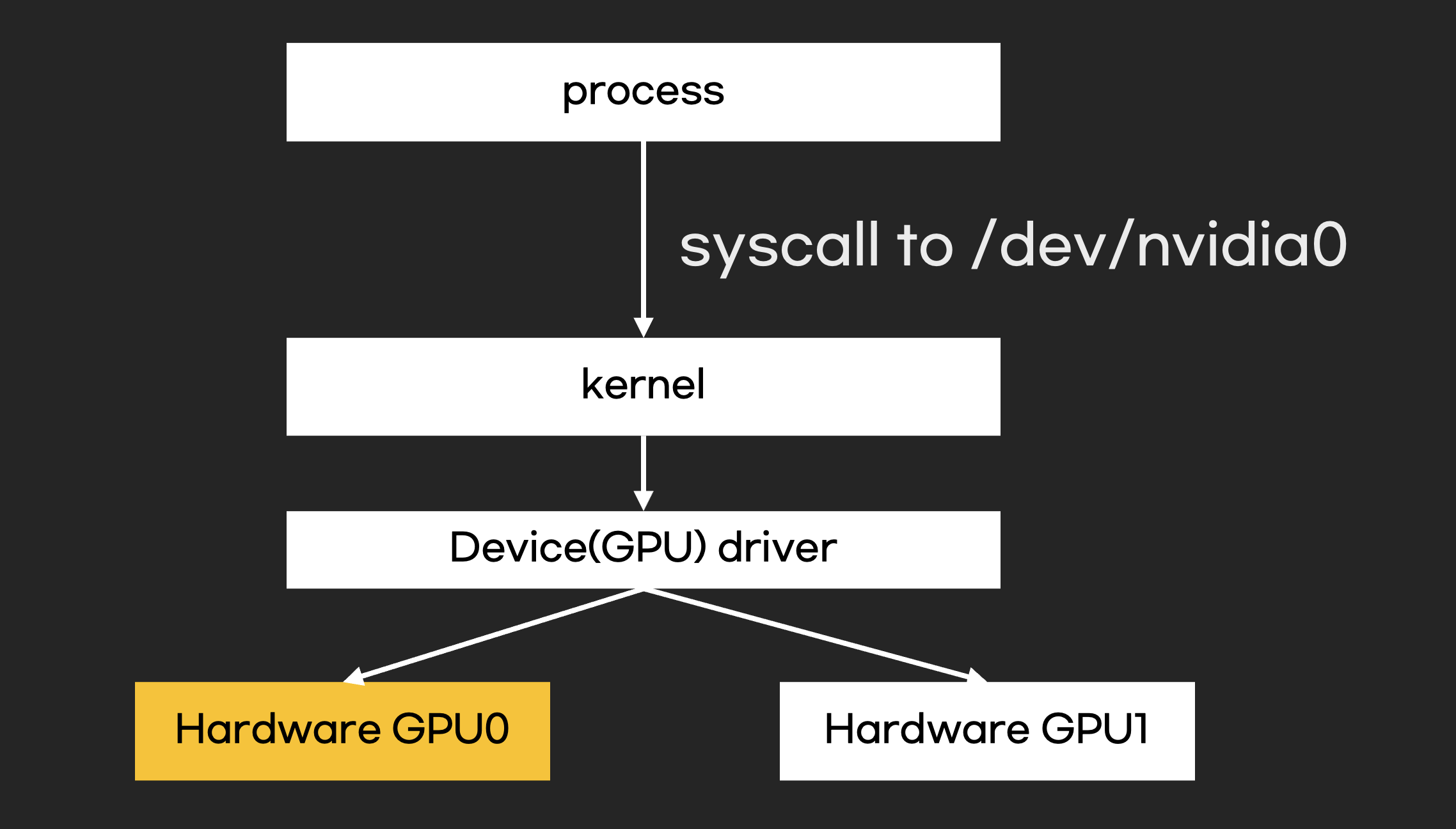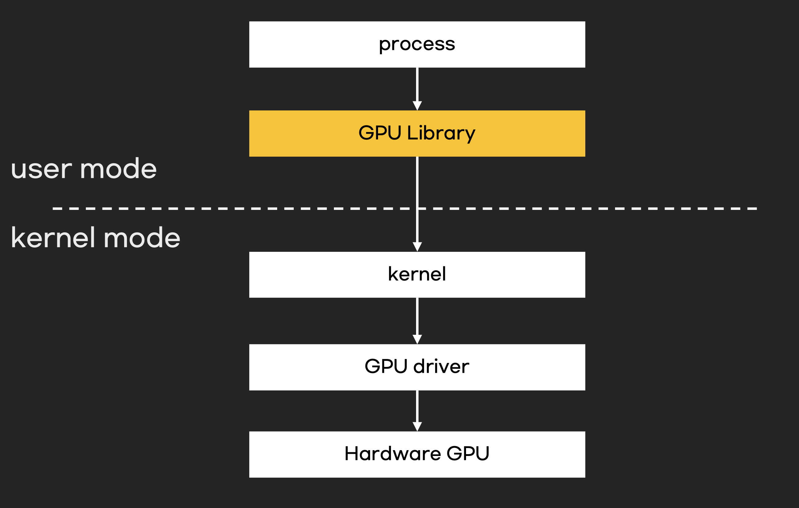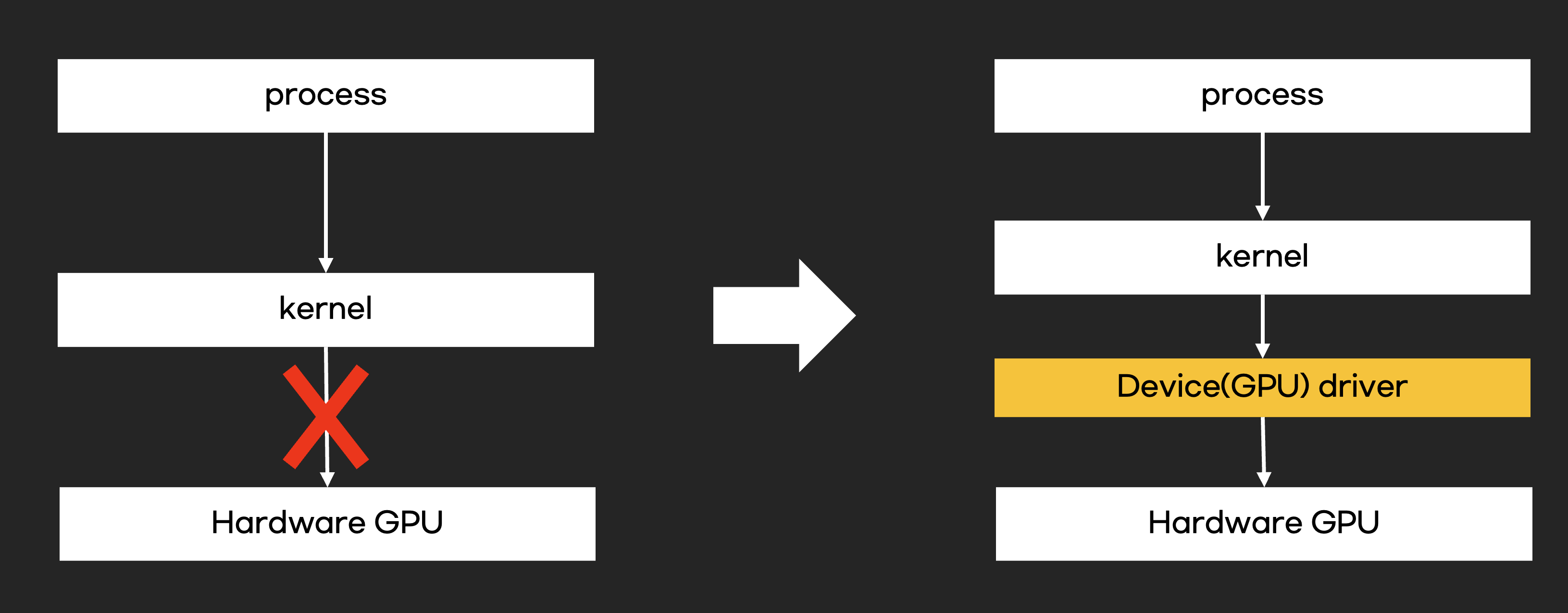 운영체제는 CPU, 메모리, 디스크 같은 표준 하드웨어 제어할 수 있지만 GPU는 제어하지 못합니다. GPU는 CPU와 메모리처럼 필수 하드웨어가 아니기도 하며, 모든 GPU 제조사에 맞춰 운영체제를 개발하는 것은 부담스럽니다. 따라서 운영체제가 직접 GPU를 제어하는 것이 아니라 GPU 드라이버에게 GPU제어를 위임합니다.