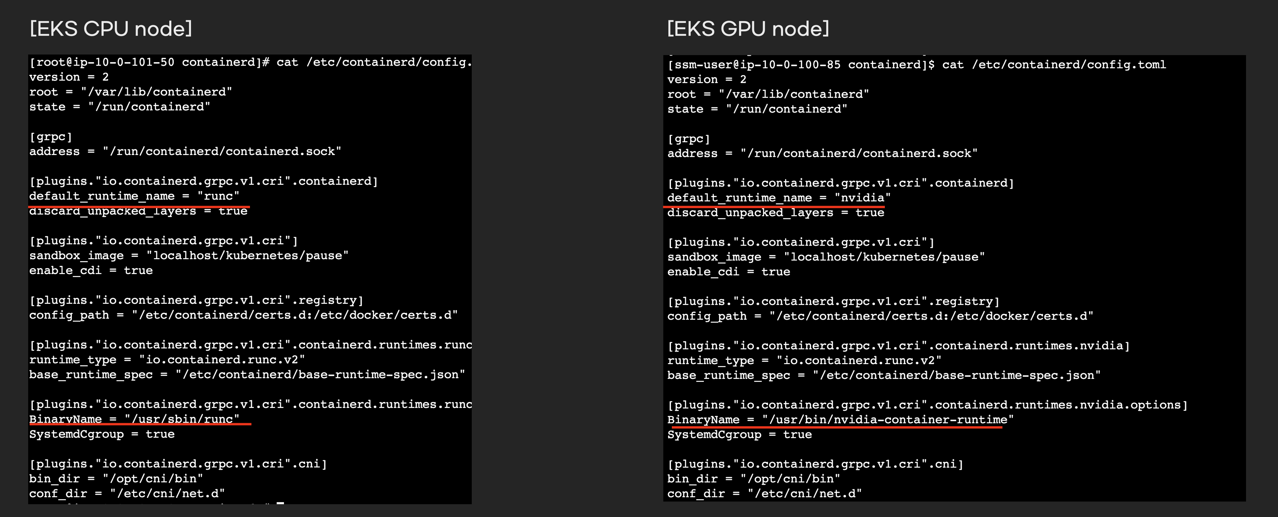 containerd기준 config.toml파일을 보면 컨테이너 실행 바이너리가 runc가 아니라 nvidia-container-runtime로 되어 있습니다.