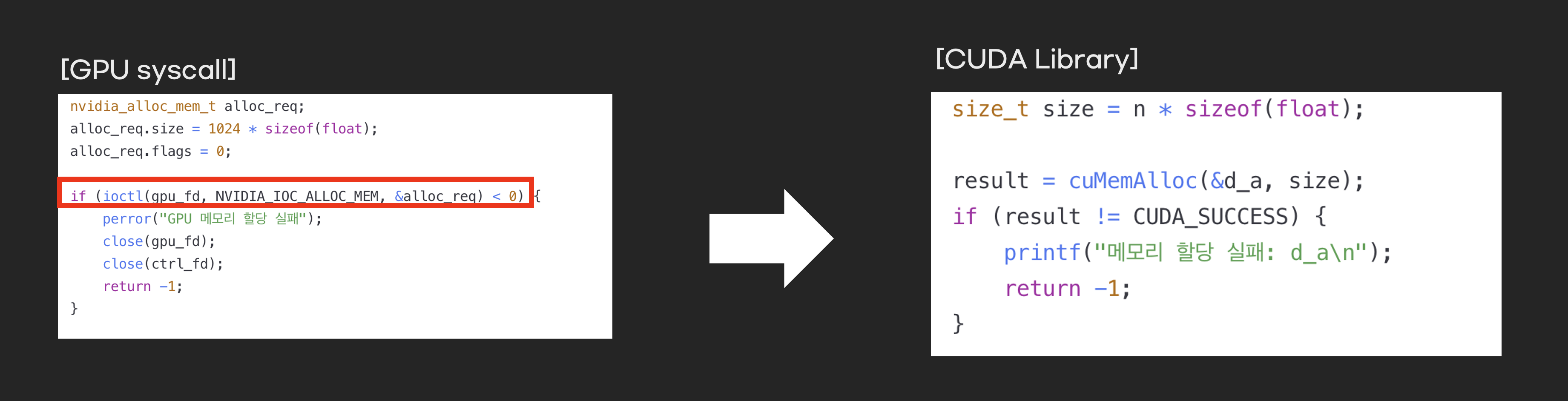 GPU 라이브러리를 사용하면 개발자는 syscall 호출하지 않아도 GPU를 제어하는 코드를 쉽게 작성할 수 있습니다. GPU라이브러리가 내부적으로 syscall을 호출하기 때문입니다.