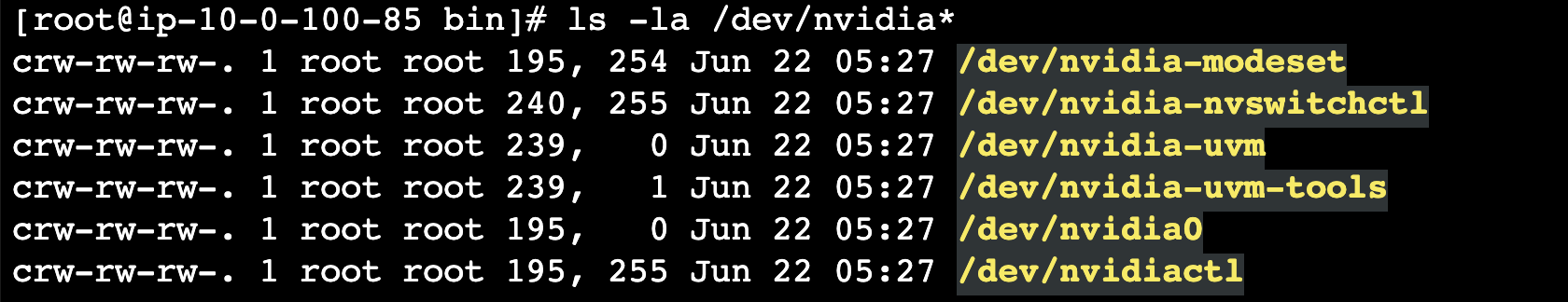 리눅스는 모든 것을 파일로 관리하기 때문에 하드웨어 장비 GPU도 파일로 관리됩니다. 이 파일을 디바이스 파일이라고 합니다. 아래 예제는 nvidia GPU가 장착된 인스턴스에서 디바이스 파일을 확인했습니다.