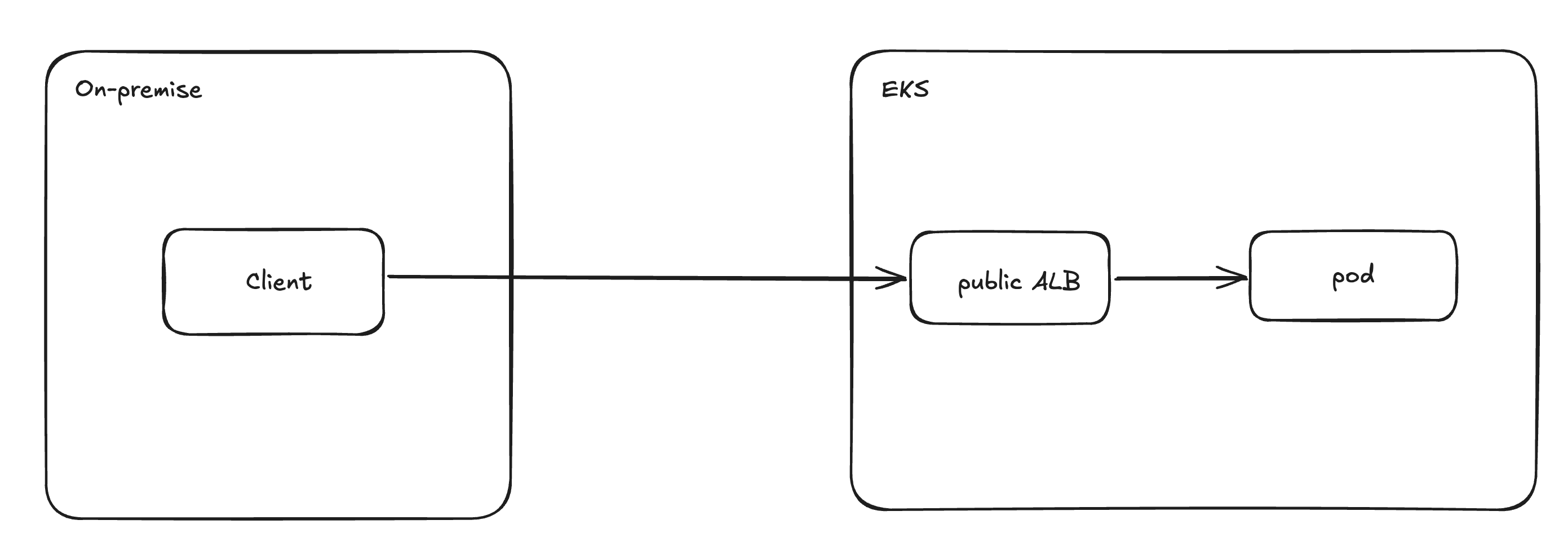 실제 서비스 장애가 있었지만 애플리케이션 에러가 없어 조금 늦게 장애를 발견했습니다. 장애가 난 아키텍처는 아래 그림과 같습니다. 애플리케이션은 스프링부트이고 EKS pod에서 실행되고 있었습니다. 클라이언트는 on premise에 위치하고 EKS pod API를 호출하기 위해 public ALB를 사용합니다.