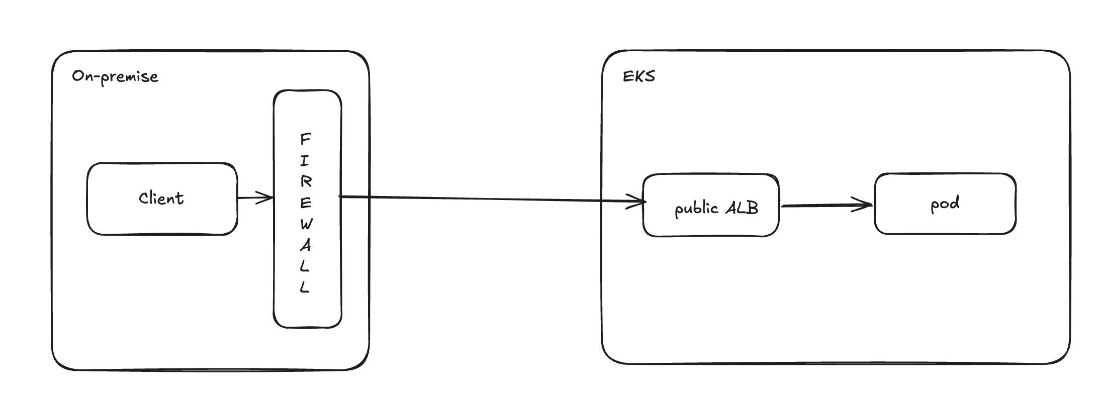 실제 서비스 장애가 있었지만 애플리케이션 에러가 없어 조금 늦게 장애를 발견했습니다. 장애가 난 아키텍처는 아래 그림과 같습니다. 애플리케이션은 스프링부트이고 EKS pod에서 실행되고 있었습니다. 클라이언트는 on premise에 위치하고 EKS pod API를 호출하기 위해 public ALB를 사용합니다.