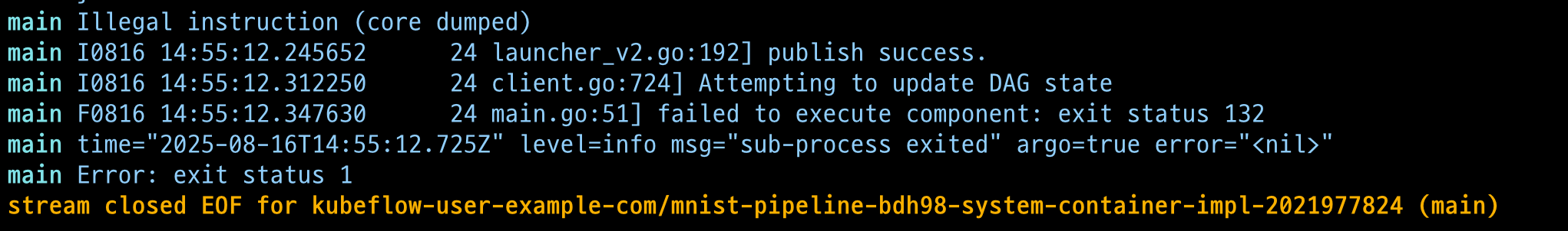 MacOS 또는 ARM CPU를 사용할때, kubeflow에서 illegal instruction (core dump)에러가 발생할 수 있습니다. 이 에러는 사용하는 컨테이너 이미지가 ARM을 지원하지 않을 때 발생합니다. 대표적으로 tensorflow가 ARM을 지원하지 않습니다.