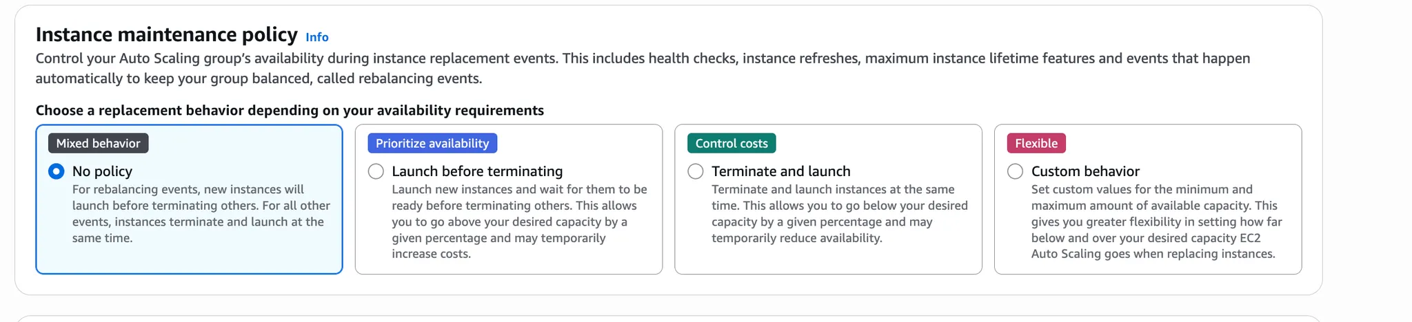 - 인스턴스 관리 정책 4가지(Launch before terminating, Terminate and launch, No policy, Custom behavior)는 각각 어떻게 동작하나요?