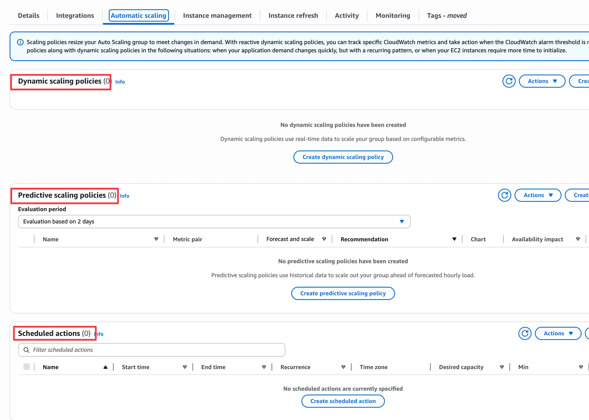 - Scheduled actions: 특정 시간에 인스턴스 개수를 조절하도록 미리 일정을 설정합니다.