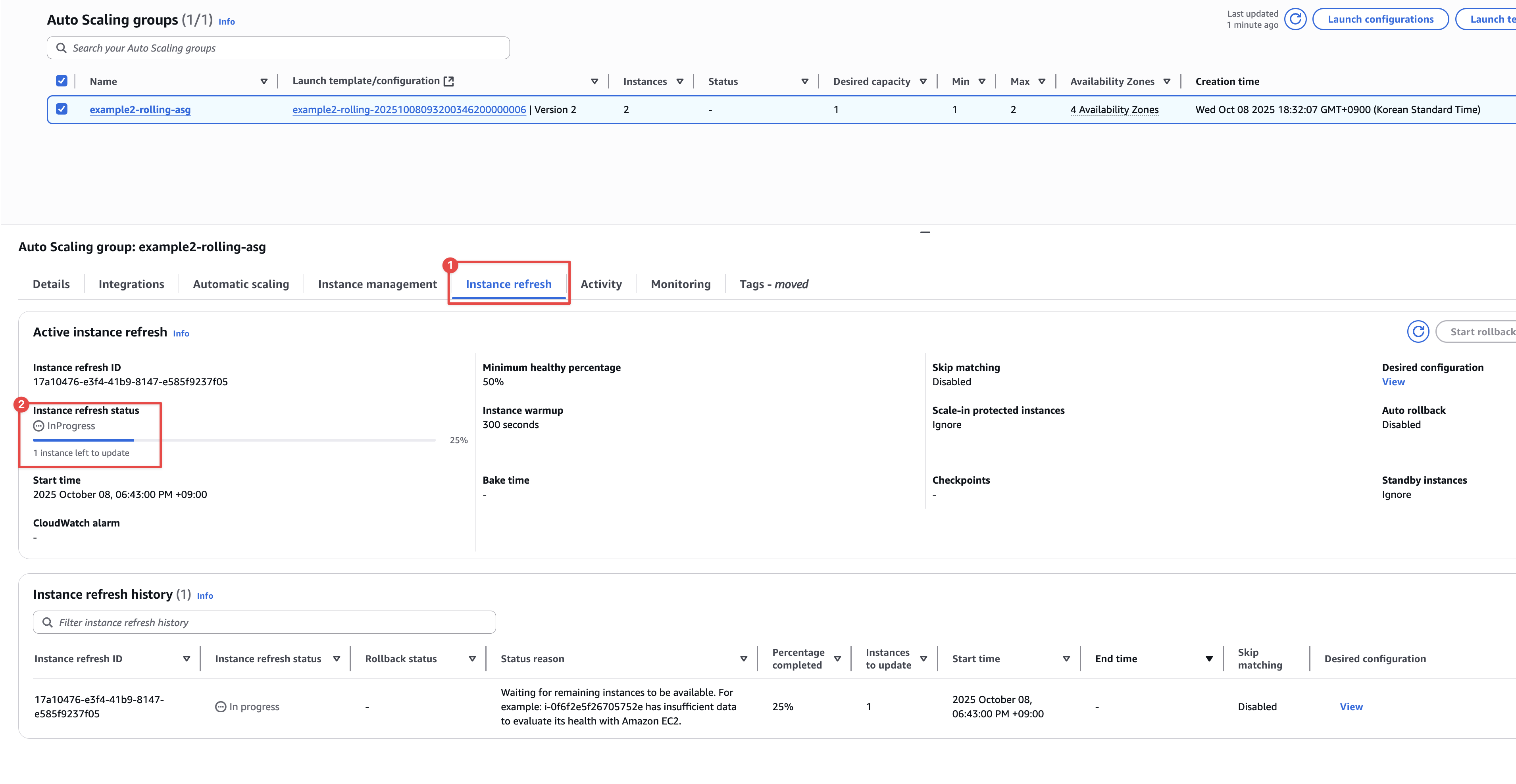 - Launch before terminating: EC2인스턴스를 새로 생성하고 그 이후에 기존 인스턴스를 제거합니다.