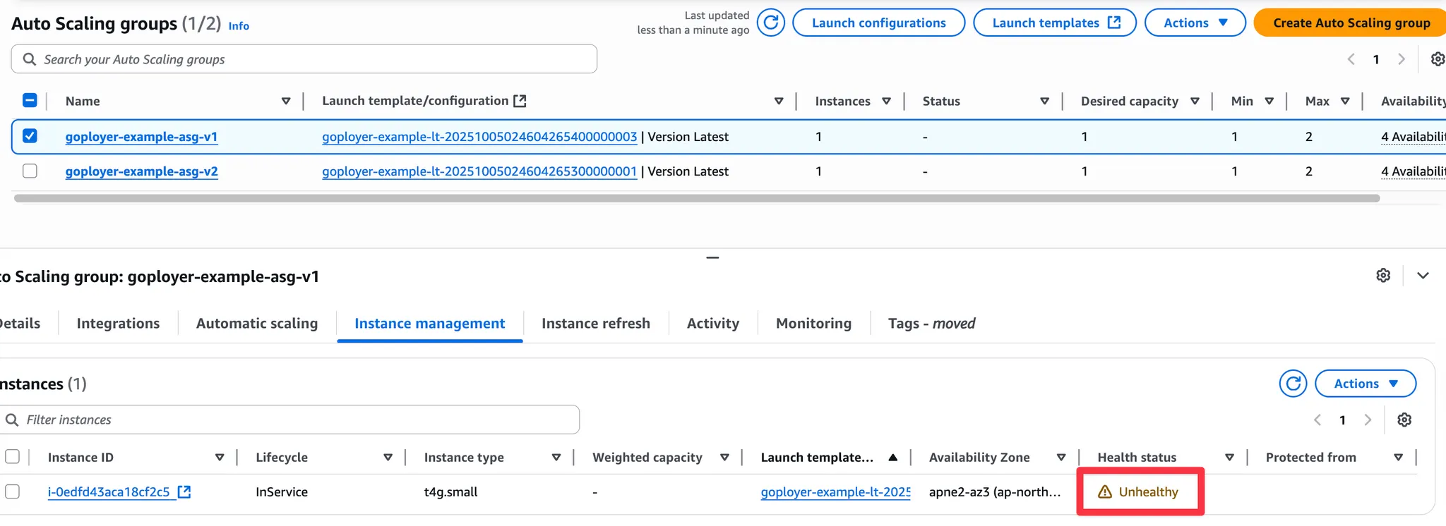 아래 예제는 ASG가 비정상 인스턴스를 감지하고 교체하는 과정을 보여줍니다. 인스턴스 관리 정책으로는 No policy를 사용했습니다. 그림에서 볼 수 있듯이 ASG는 먼저 새로운 EC2 인스턴스를 생성한 후 기존의 비정상 인스턴스를 제거했습니다.