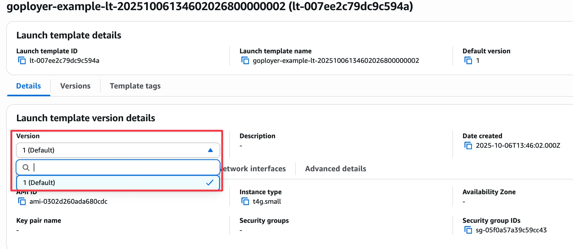 아래 그림은 Launch template에서 버전을 설정할 수 있다는 것을 보여줍니다.