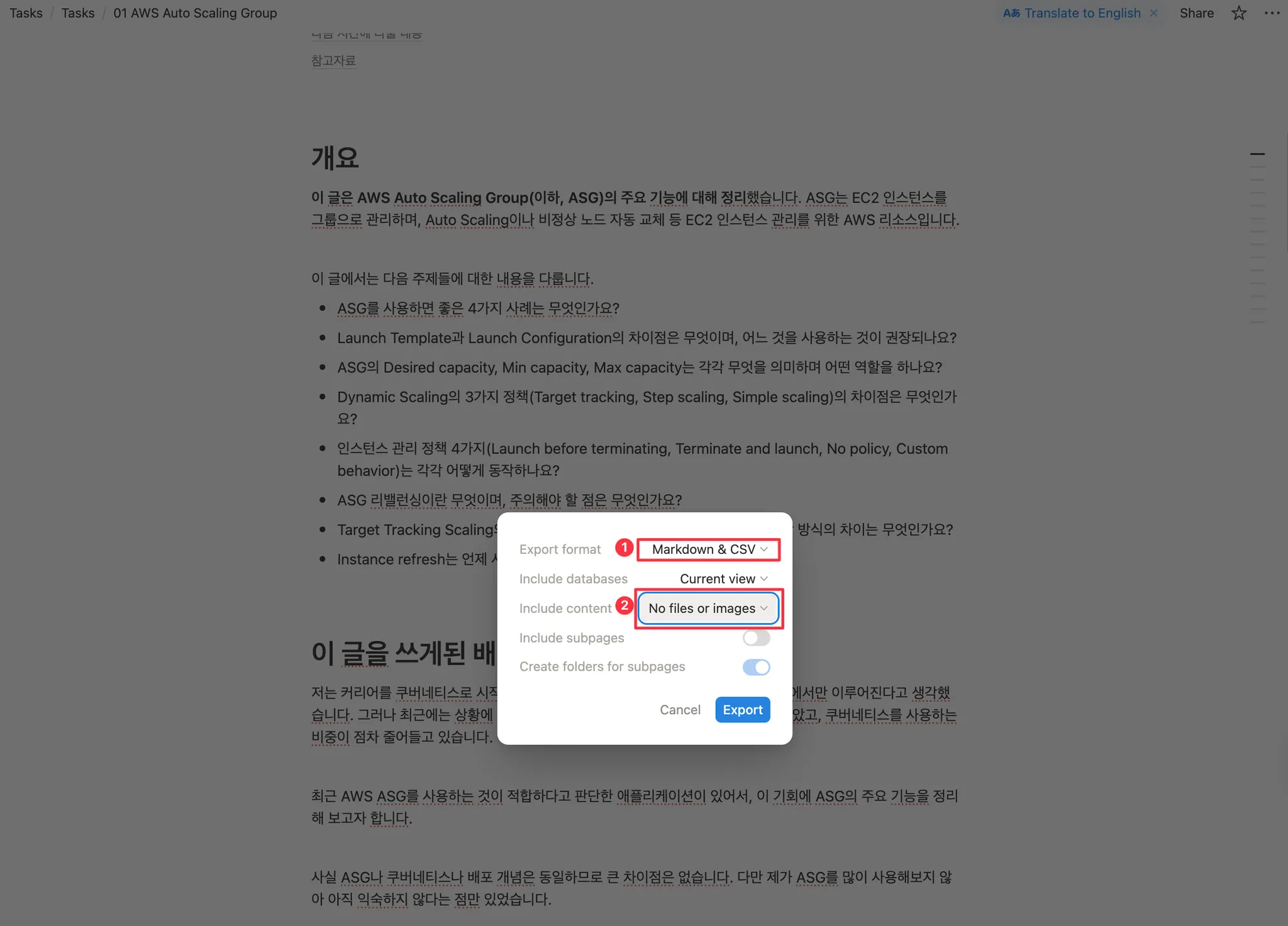 1. Notion에서 Export를 합니다. 이때 "No files or images" 옵션을 선택합니다.