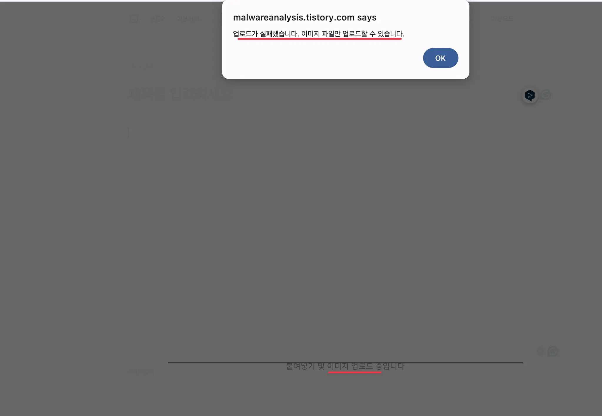 - 오류 메세지: “업로드가 실패했습니다. 이미지 파일만 업로드 할 수 있습니다.”