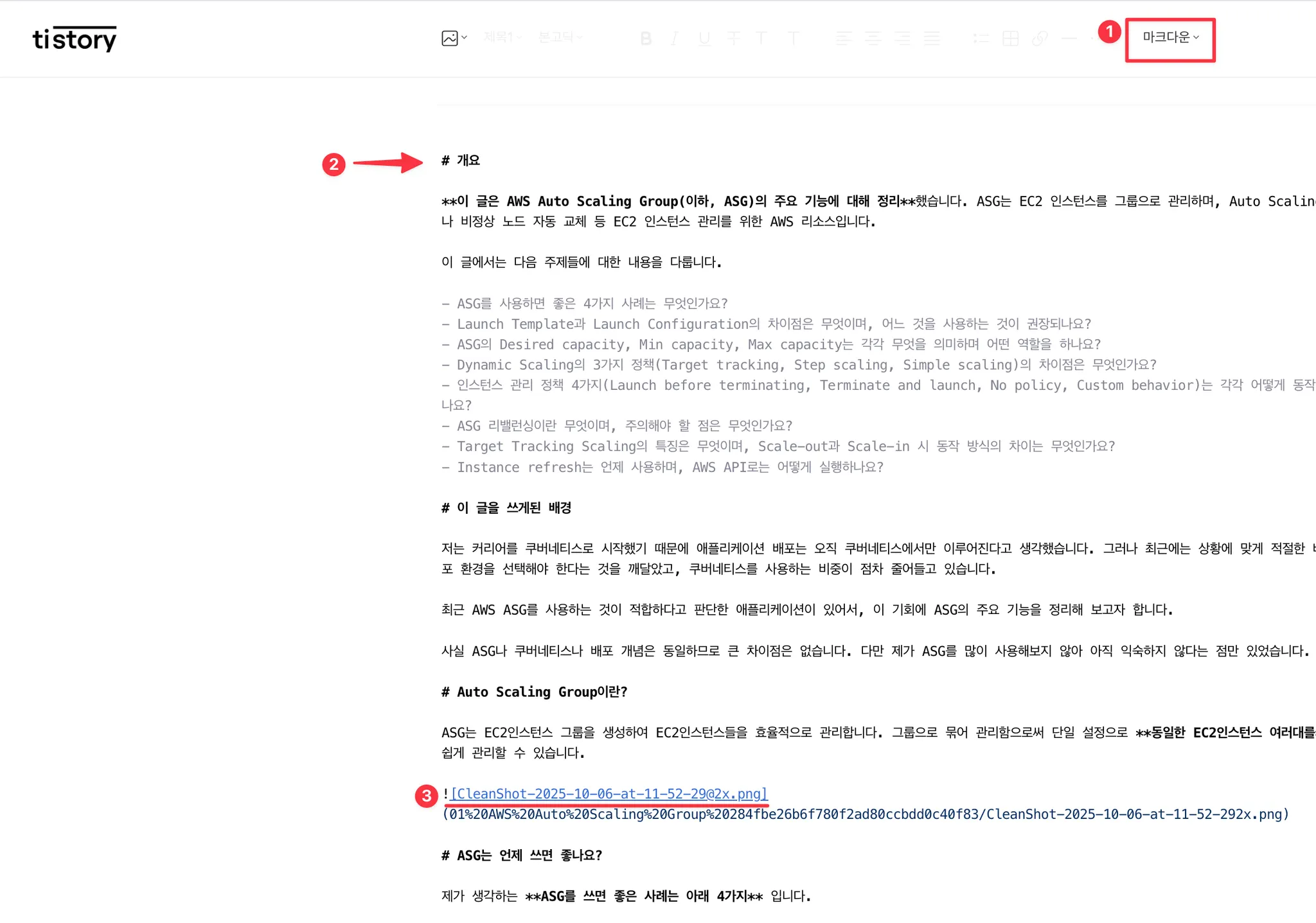 3. 티스토리에서 글쓰기 버튼을 클릭합니다. 오른쪽 위에 있는 글 형식을 마크다운으로 변경한 후, 다운로드한 마크다운 파일 내용을 복사해 티스토리에 붙여넣습니다. 이렇게 하면 이미지가 텍스트로 인식되어 티스토리 에러 메시지가 표시되지 않습니다.