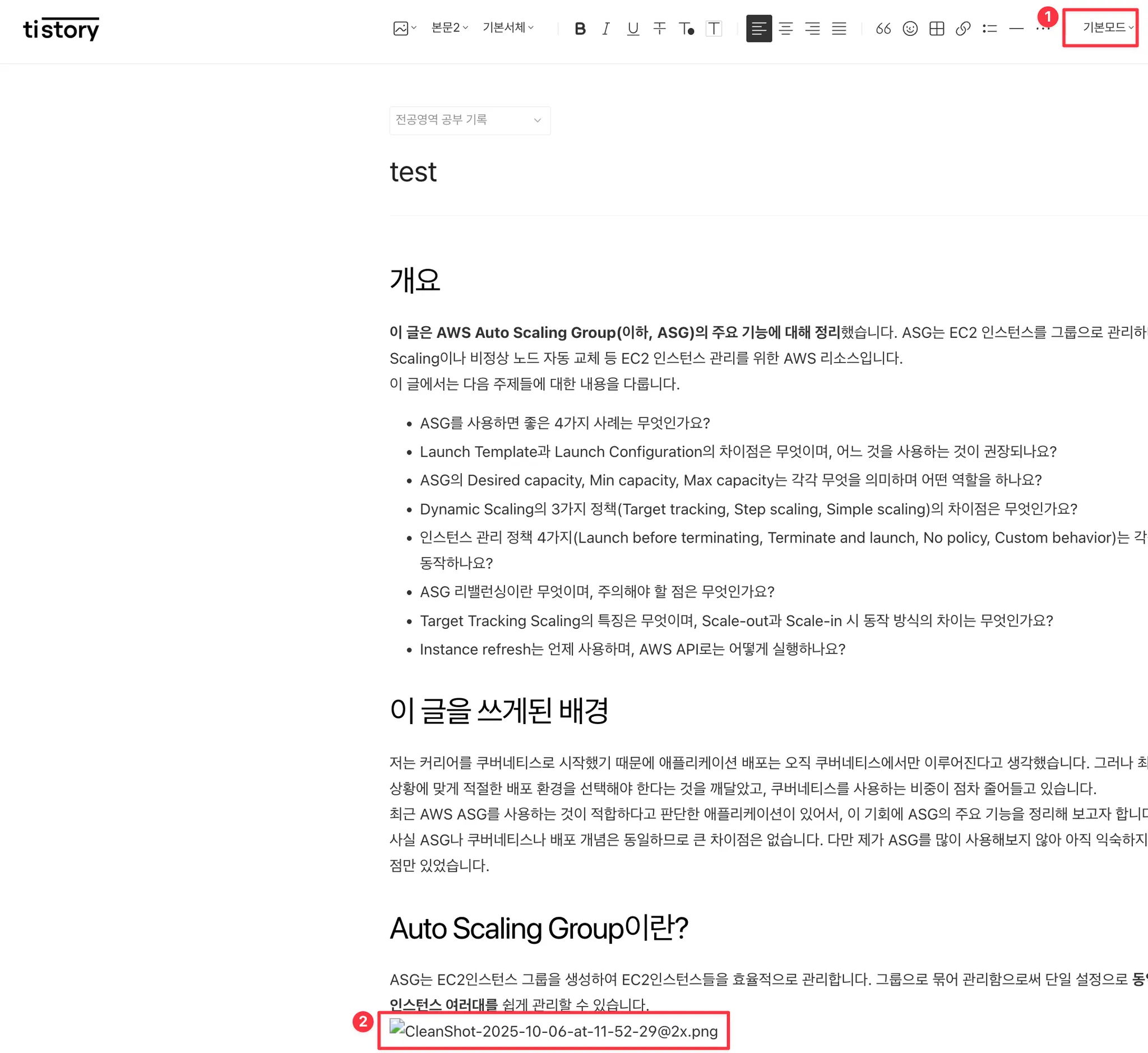 4. 오른쪽 위에서 글쓰기 모드를 기본모드로 변경합니다. 이미지는 경로를 찾을 수 없어 깨져서 표시됩니다. 이제 원본 이미지를 찾아 하나씩 수동으로 삽입하면 됩니다.