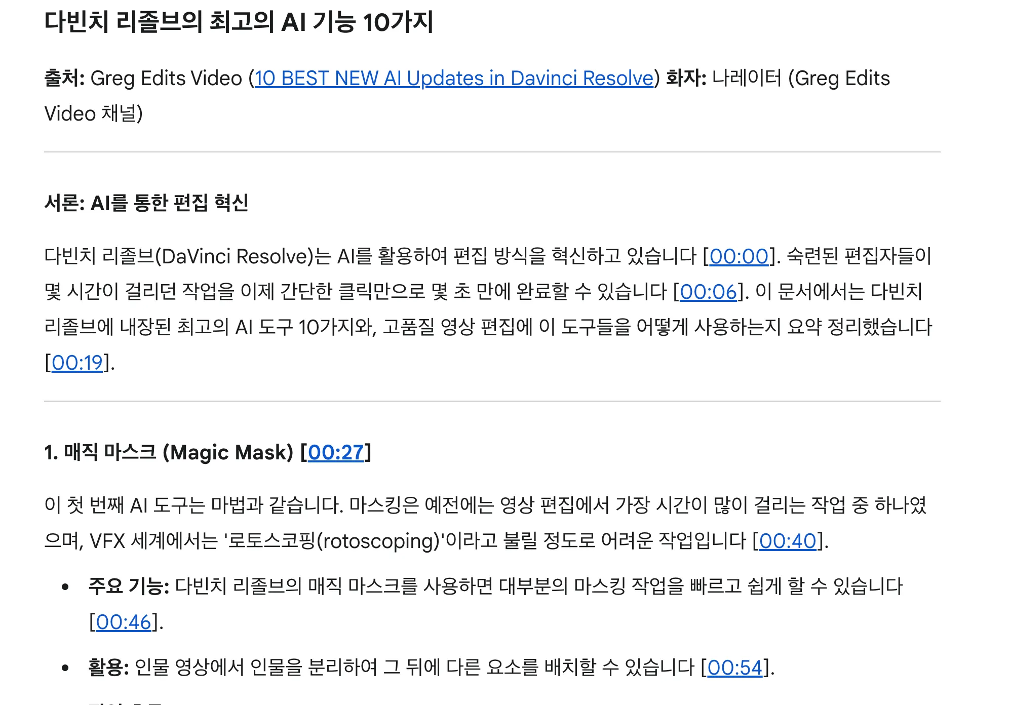 AI가 글을 생성할 때 근거가 되는 타임스탬프를 제공합니다. 타임스탬프를 통해 원하는 부분을 유튜브 영상에서 바로 찾아볼 수 있습니다. 테스트 영상은 제가 동영상 편집툴로 사용하고 있는 다빈치리졸브 신규기능영상입니다.