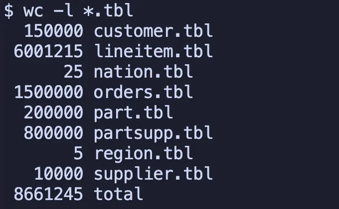 dbgen을 실행하여 tbl 파일을 생성합니다. 이 파일들은 각 테이블의 레코드가 있습니다.