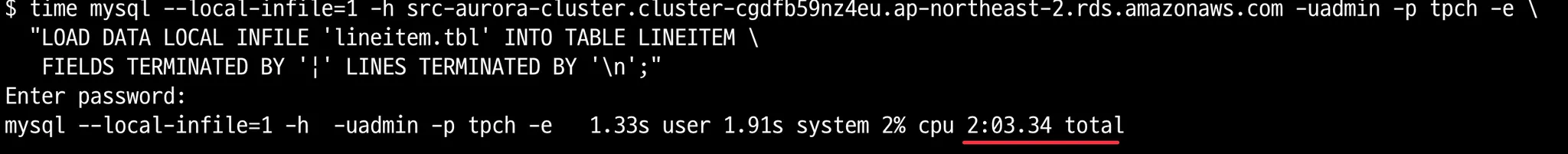 ttime mysql --local-infile=1 -h $HOST -u$USER -p tpch -e \