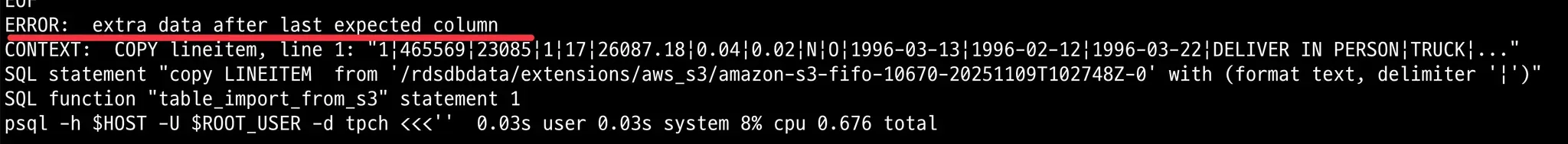 postgres는 칼럼 끝이 구분자이면 S3 import할때 에러가 발생합니다.