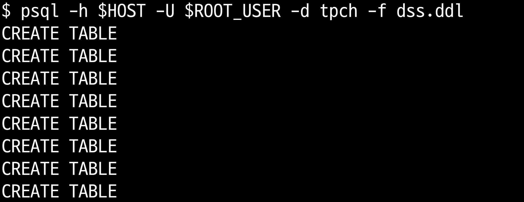 psql -h $HOST -U $ROOT_USER -d tpch -f dss.ddl