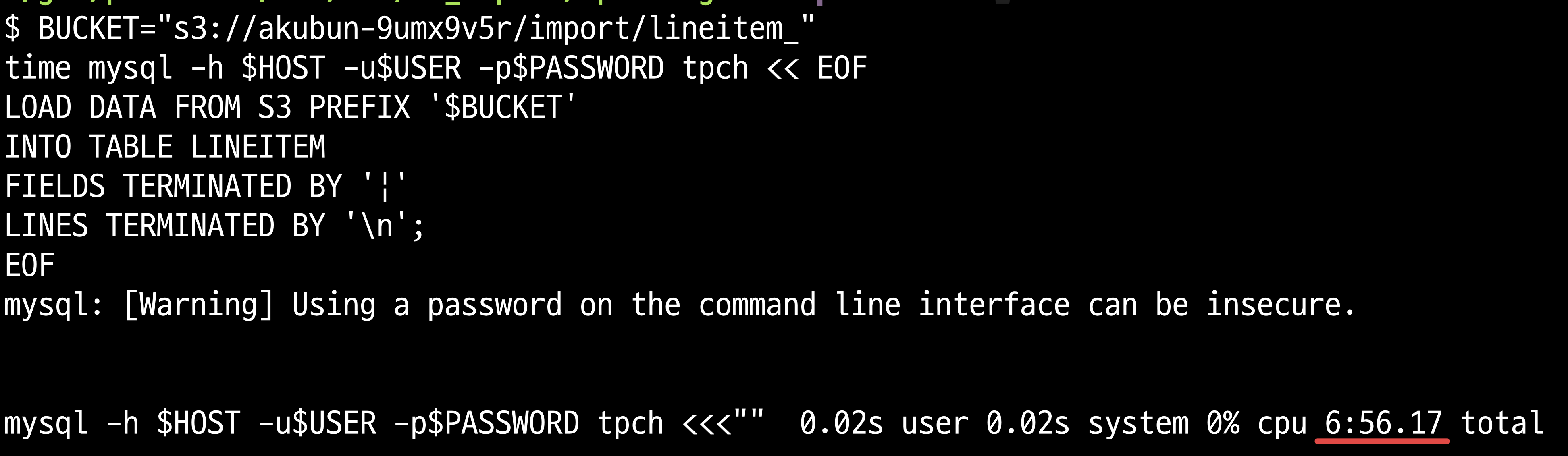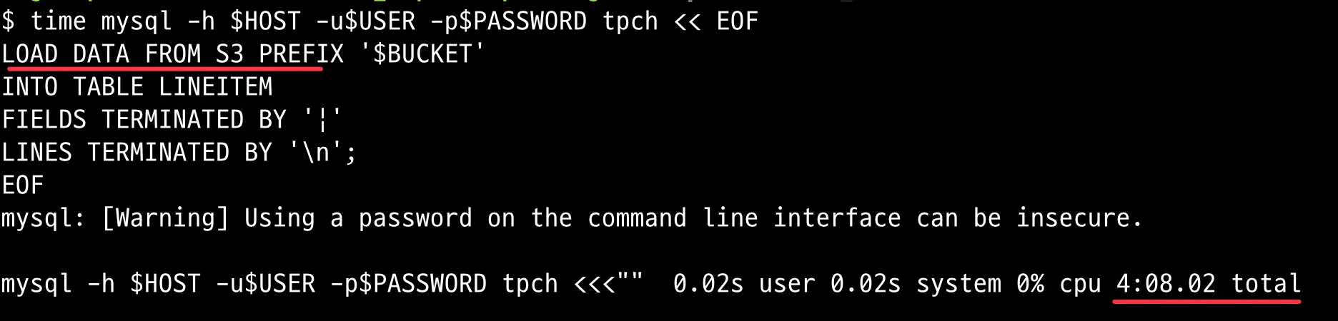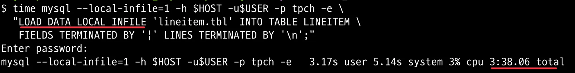 time mysql -h $HOST -u$USER -p$PASSWORD tpch << EOF
