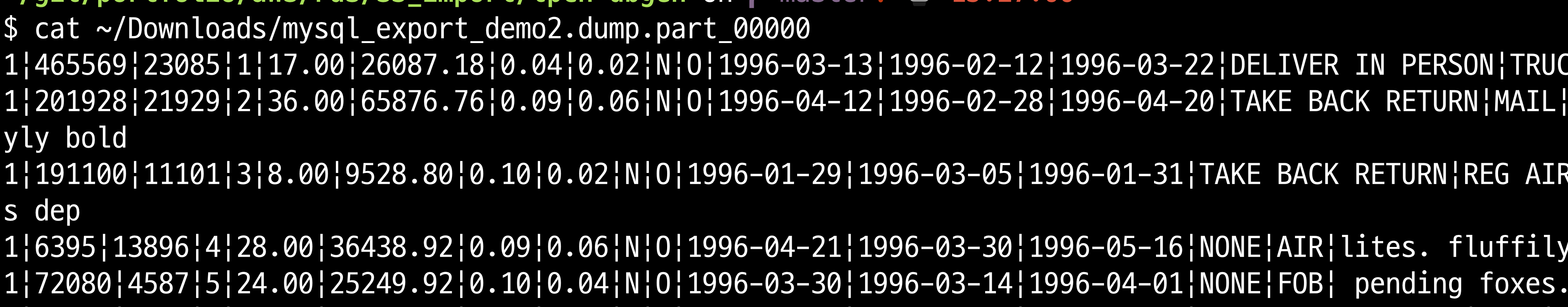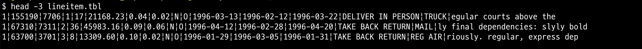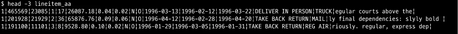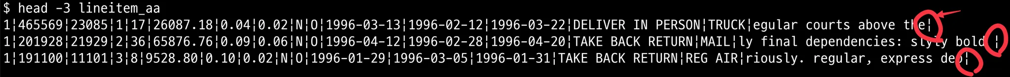 생성된 lineitem.tbl파일 끝에 구분자가 없는지 확인합니다.