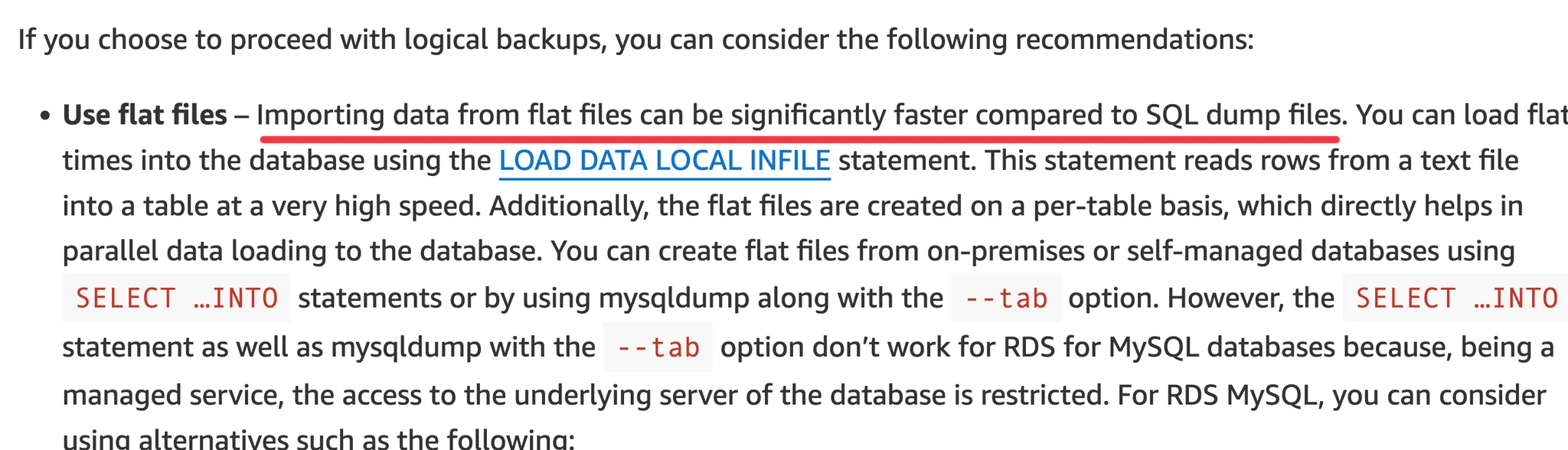 AWS 블로그에는 INFILE과 S3 import를 비교한 글이 없지만, INFILE import 성능이 매우 좋다고 설명합니다.