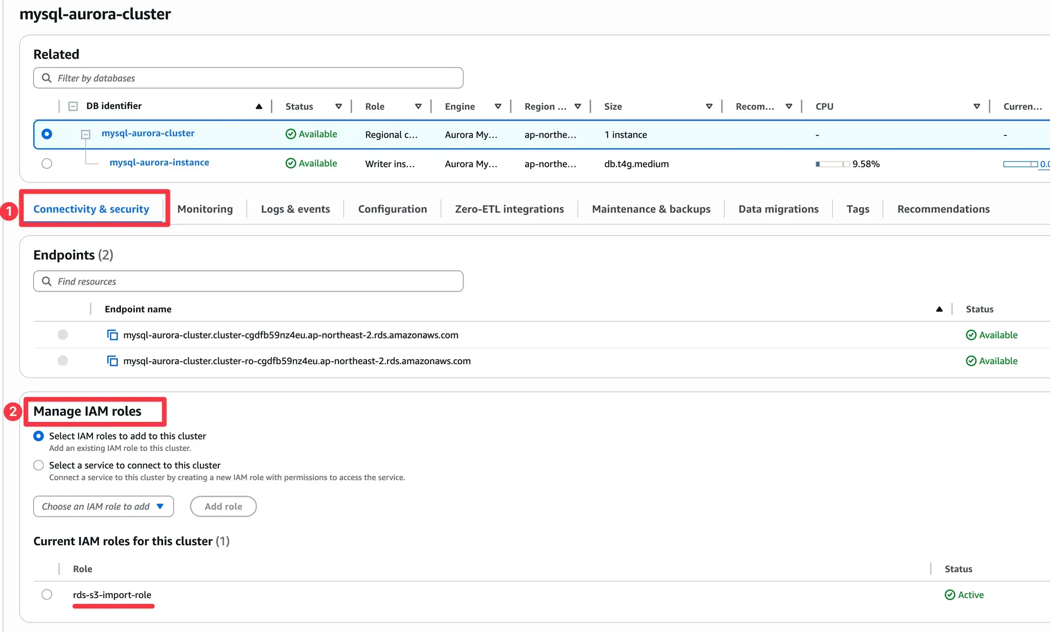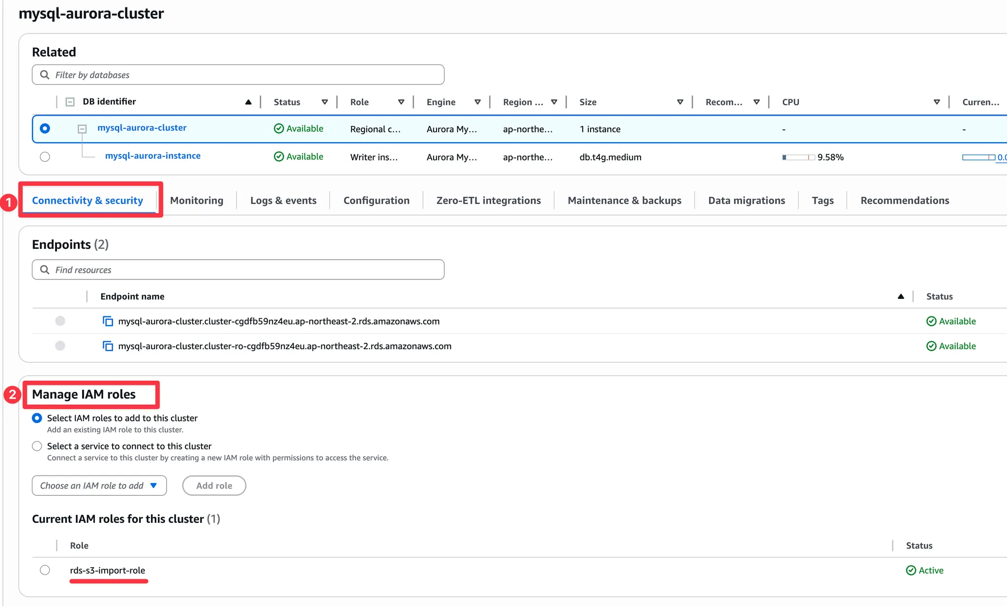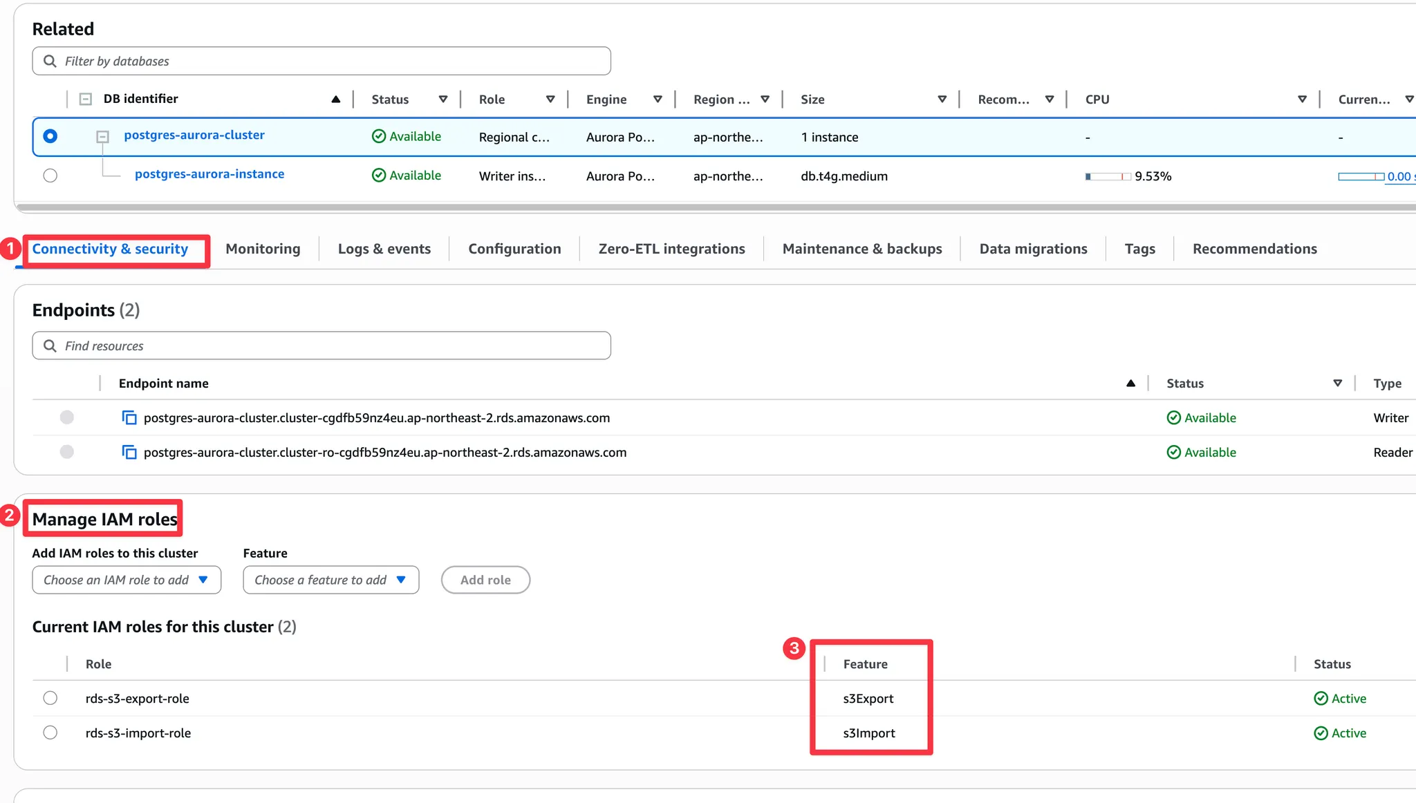 RDS 대시보드에서 Connectivity & security → Managed IAM roles에서 IAM role을 attach합니다.