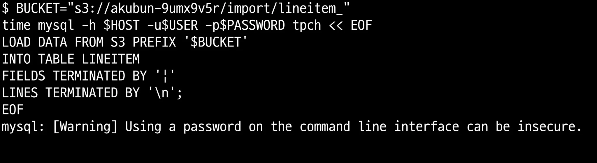 LOAD DATA FROM S3 PREFIX '$BUCKET'