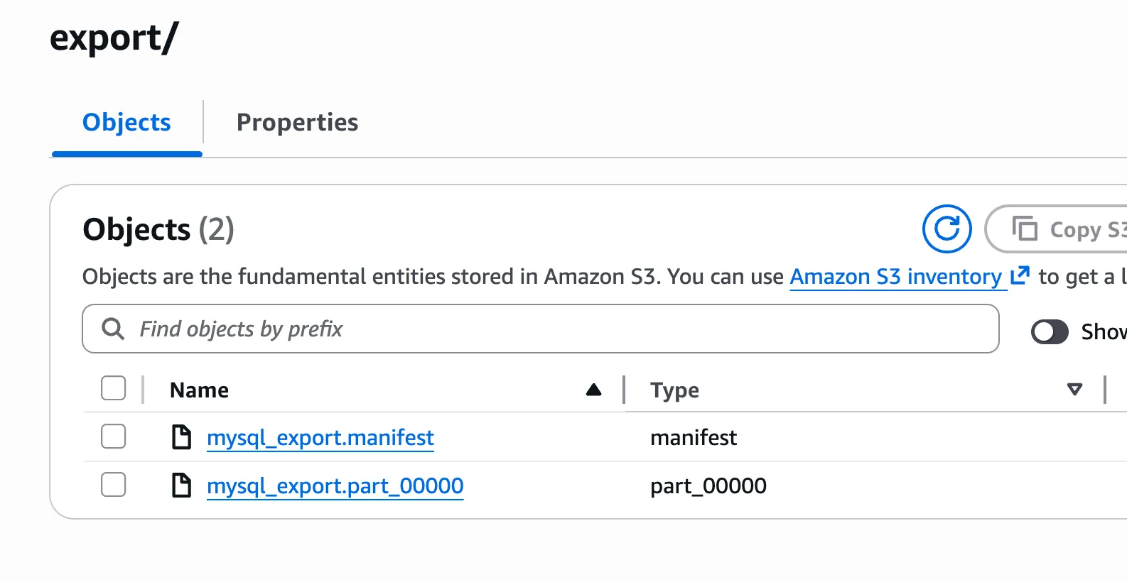 S3 export는 INTO OUTFILE S3 sql로 실행합니다. 버킷경로는 prefix를 지정합니다.