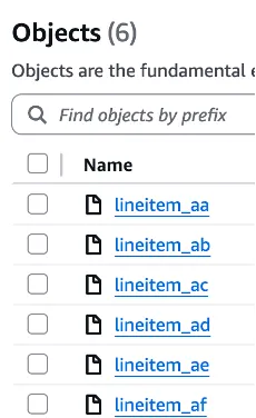 저는 S3버킷에서 lineitem_으로 시작하는 버킷 item을 했습니다.