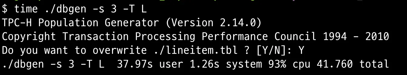 time ./dbgen -s 3 -T L
