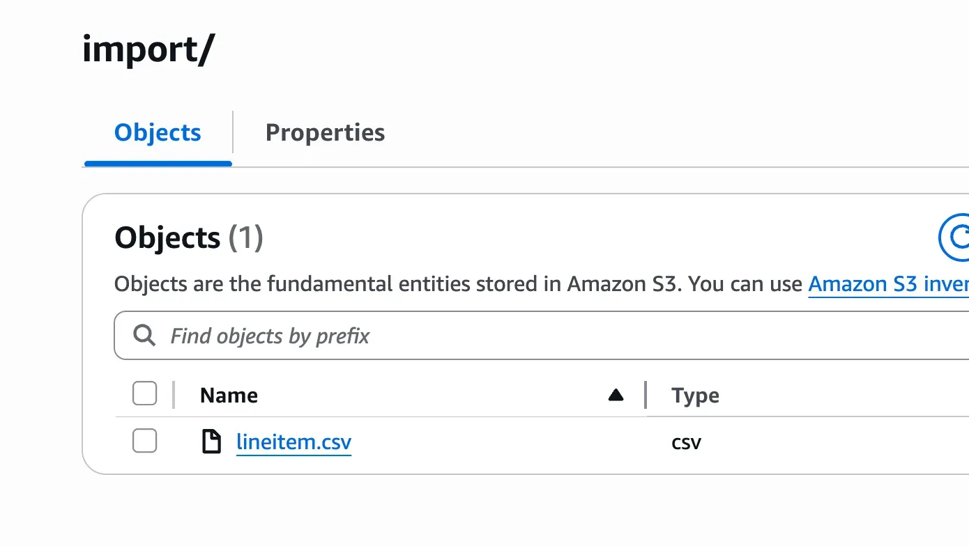 - 버킷 위치: s3://akubun-9umx9v5r/import/lineitem.csv