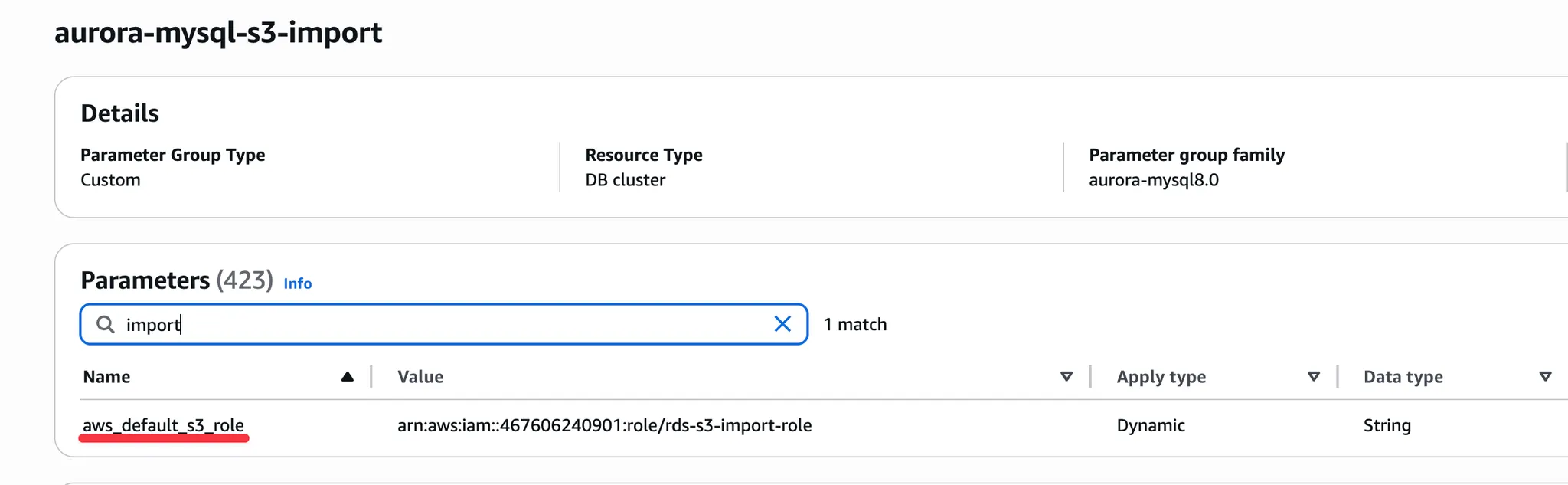 RDS에 IAM role을 연결한 후 MySQL cluster parameter group을 수정합니다. "aws_default_s3_role"에 연결한 IAM role을 입력합니다. 설정을 완료한 후 RDS 인스턴스를 재부팅합니다.
