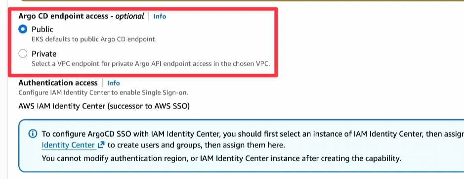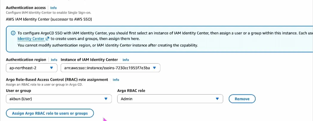 ArgoCD user/group은 AWS identity center로 관리합니다. 다르게 말하면 AWS identity center사용이 강제됩니다.