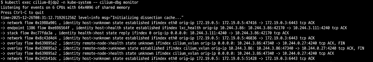 kubectl exec {cilium daemonset pod} -n kube-system -- cilium-dbg monitor